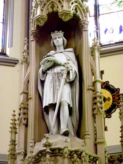 Detail - High Altar Life-size statue of the church's patron, St. Louis IX (1214-1270), king of France, sculpted by Joseph Sibbel (Evidence: "Art Notes" in April 18, 1895 New York Times) Joseph Sibbel also did work at Holy Angels Church in Buffalo, NY. See Delma Tallerico's Joseph Sibbel of NY Born in 1214, Louis was made king at the early age of 11. He led the seventh crusade and is accredited as having enshrined the "true crown of thorns" (which he holds in this statue) in the Sainte Chapelle in Paris which he had built for the purpose of housing the sacred relic. A secular Franciscan brother, he died from the plague near Carthage on a crusade in 1270. He was later canonized. |