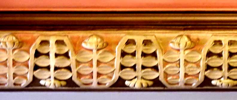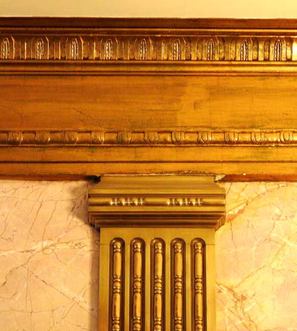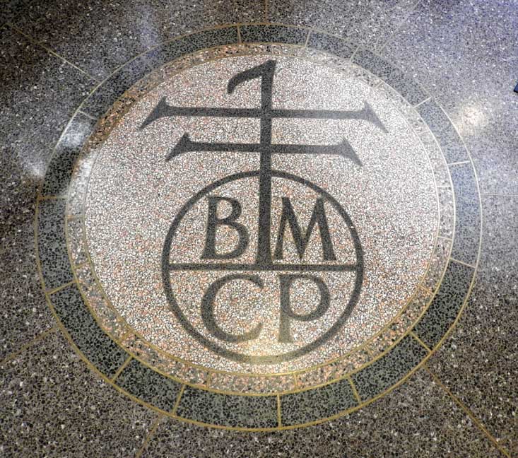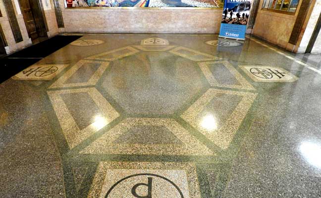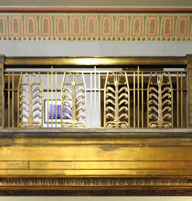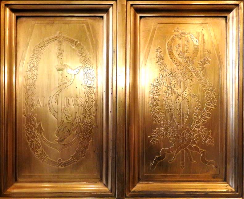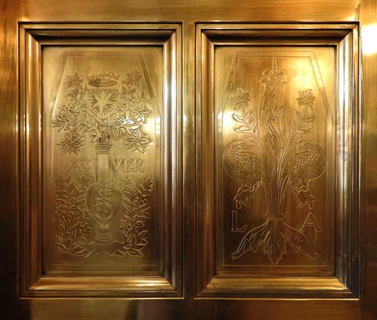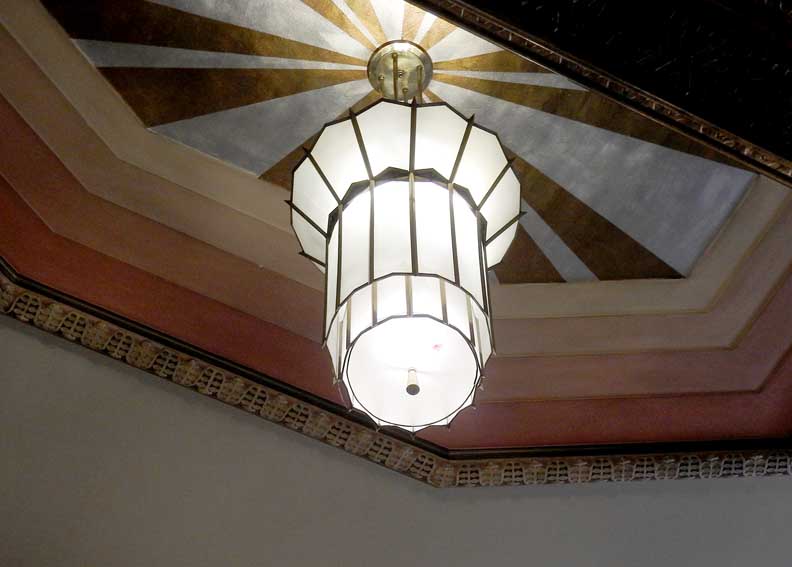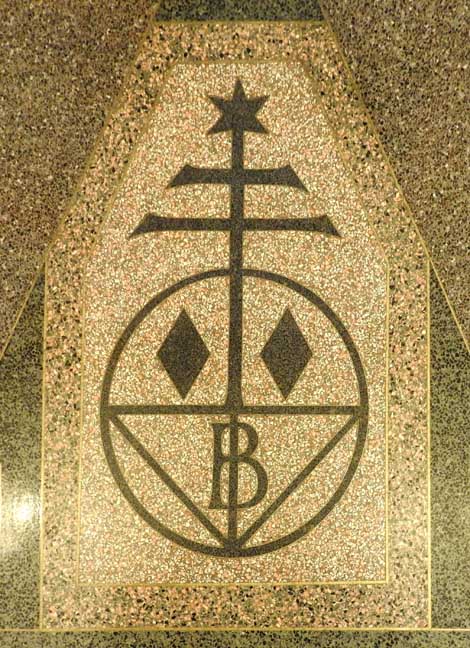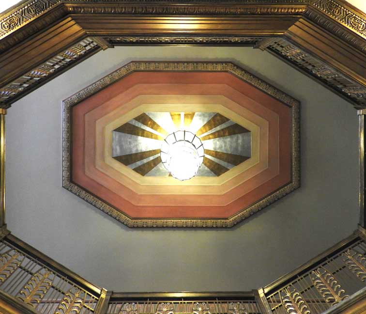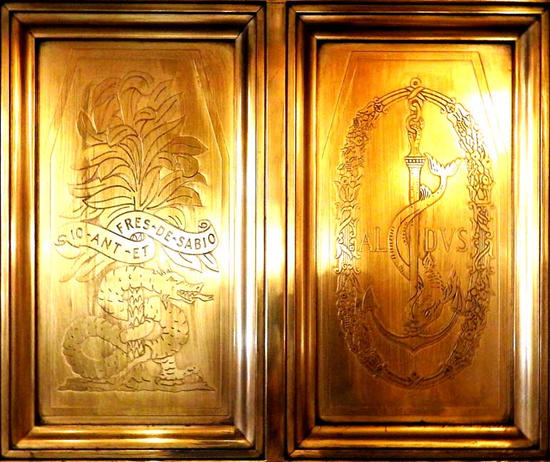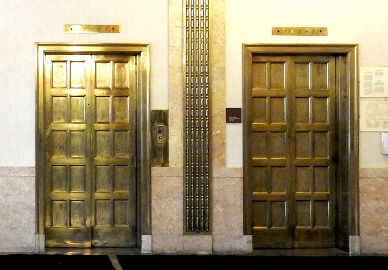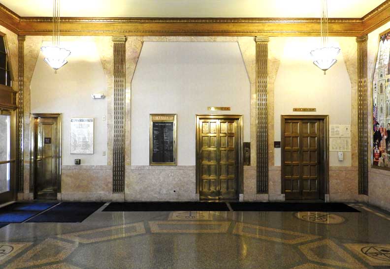 One of the most important Art Deco style interiors in the city ![]() Main Street entrance ![]() Looking up in the middle of the lobby: Art Deco chandelier, ceiling surround, balcony balustrade ... Three details below: ![]() Detail #1 - Art Deco chandelier, ceiling surround ![]() Detail #2 - Second floor balcony balustrade ![]() Detail #3 - Second floor balcony balustrade detail ![]() Molding ![]() Details below: ![]() Art Deco chandelier ![]() ![]() ![]() Center: bead-and-reel, detailed in photo below: ![]() Bead-and-reel ![]() Incised elevator panels depict historic printers' marks ![]() ![]() Left panel: Aldus Pius Manutius (1449 – February 6, 1515) was an Italian humanist who became a printer and publisher when he founded the Aldine Press at Venice. The fish is a dolphin. SOURCE: Wikiwordbook (online October 2016) ![]() ![]() Left panel: Nicolini from Sabbio, Giovanni Antonio & Nicolini from Sabbio, Peter (1523 - 1546). Original printers of Sabbio Chiese near Brescia active in Venice. They printed texts in Greek. Printer's mark: Cabbage with a snake coiled at the stem. On the sides are the names: Io. Anto et brothers. SOURCE: CERL Thesaurus (online October 2016) Right panel: Aldus Pius Manutius. Same as above. ![]() ![]() ![]() Printers' marks ... Terrazzo floor ![]() Printer's mark ... Terrazzo floor ![]() ![]() Printer's mark ![]() ![]() ![]() |