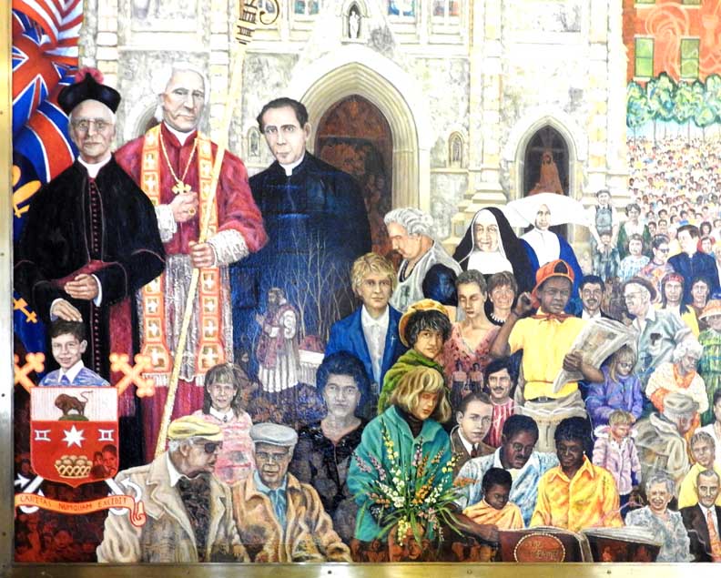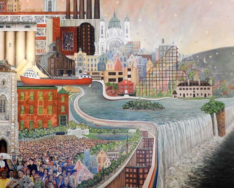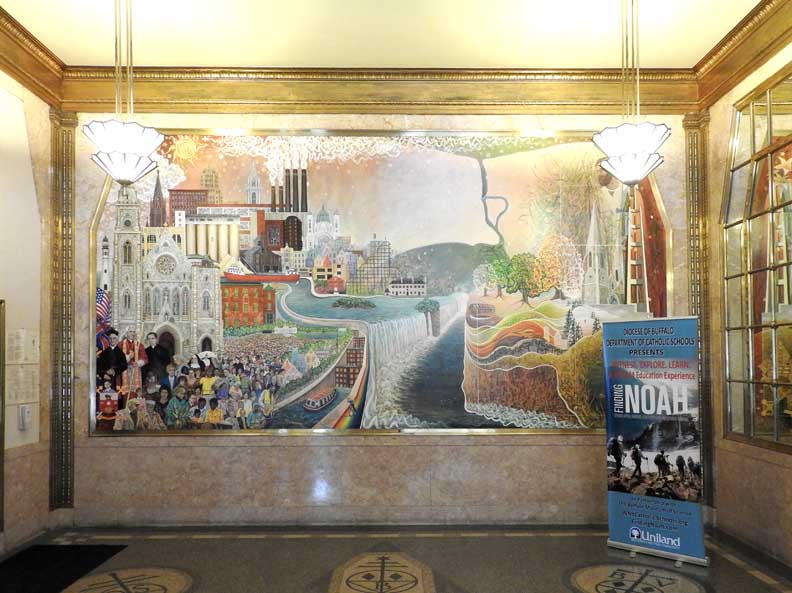![]() 1989 mural by Rev. Thomas Ribits ... Four details below: ![]() Upper left background: St. Louis Church, Guaranty Building, City Hall, Old County Hall. Middle buildings: Courier Express Building, Concrete and wooden grain elevators, Our Lady of Victory Basilica. Bottom left foreground: St. Joseph's Cathedral. ![]() Fr. Nelson Baker, Bishop John Timon, Saint John Neumann ![]() Niagara River and Niagara Falls ... Modern building: Wintergarden ![]() Packet boat in Lockport's locks ... Saxaphonist: Grover Washington, Jr. |