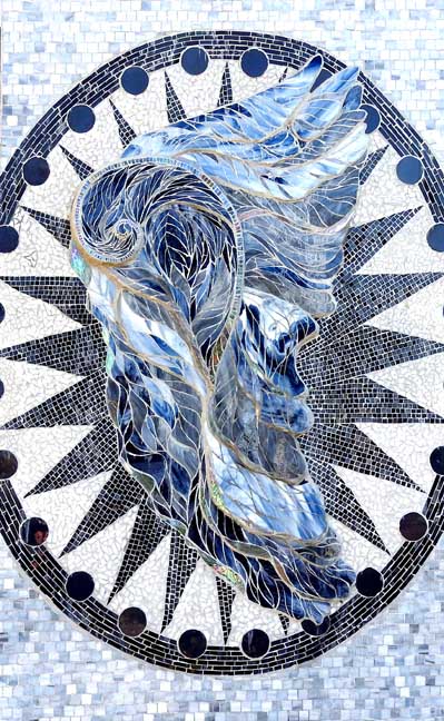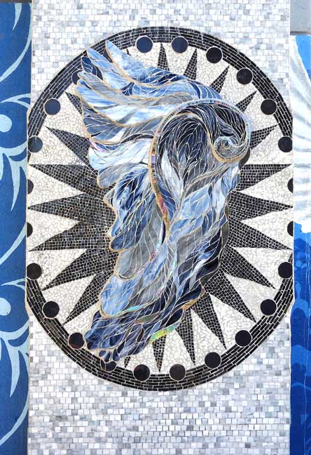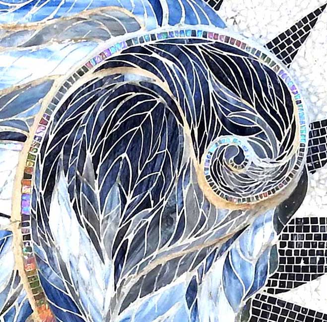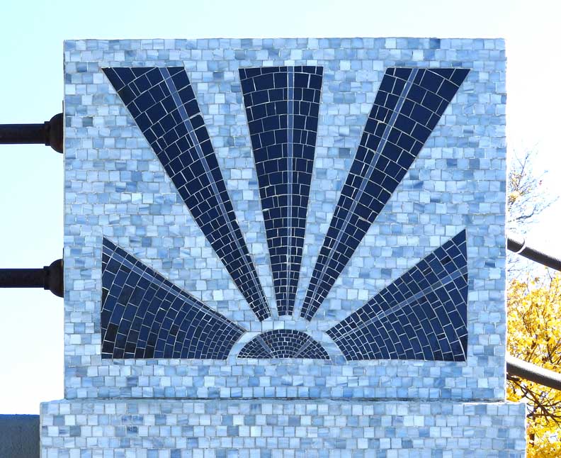2018 photos![]() Details below, from left to right: ![]() Mural and glass mosaic column ![]() Mural detail ![]() ![]() ![]() Dove imagery in the center of the mural is reinforced by flanking glass mosaic columns that also, in part, depict doves. See Megan McElf's description of the columns below. Left glass column is detailed below: ![]() Left glass mosaic column capital: sunburst ... Column background consists of 8,500 1” tiles, all hand-cut from large sheets of glass ![]() Left glass mosaic column medallion ... "The