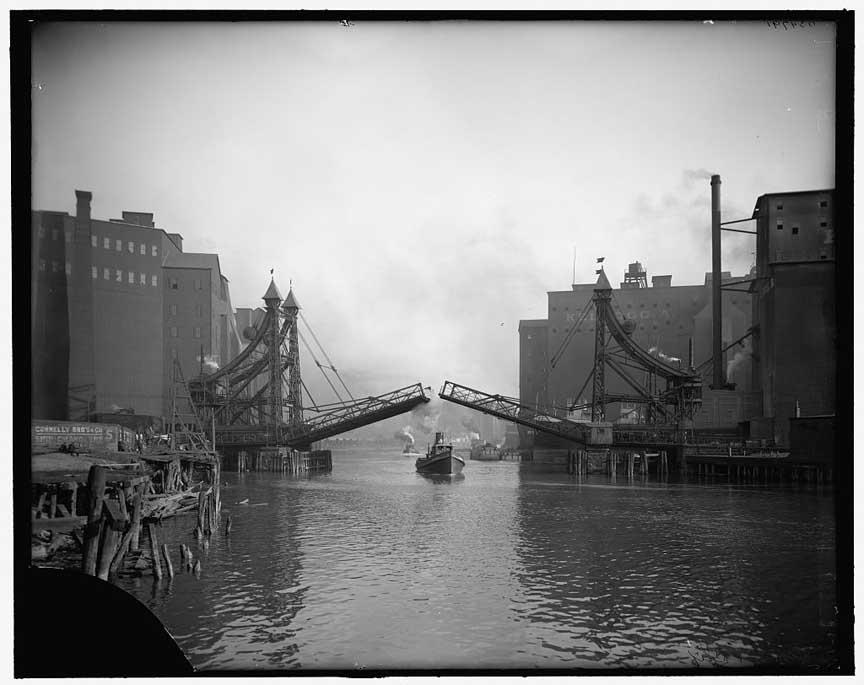 Bascule Bridge 1897-1929 ![]() 1897-1929 Jack-Knife Bridge Bascule bridge Historic Photos 1894-1941, Industrial Heritage Trail Signage ![]() 1897-1929 Jack-Knife Bascule Bridge Postcard ![]() 1897-1929 Jack-Knife Bascule Bridge City Elevators on left, Kellogg Elevators on right. Library of Congress (online October 2020) |