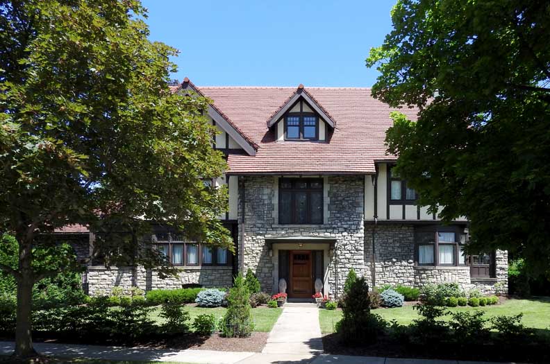 ![]() Tudor Revival ![]() Half-timbering bay and dormer (detailed below:) ... Onondaga limestone ![]() ![]() ![]() Terra cotta roof ![]() ![]() Leaded glass ribbon windows with stained glass center coat of arms (detailed below:) ![]() ![]() Tudor Revival plank door ... Leaded glass side lights ... Gibbs surround ... Onondaga limestone (detailed below:) ![]() Onondaga limestone ![]() View from Lincoln Parkway at Middlesex Road |