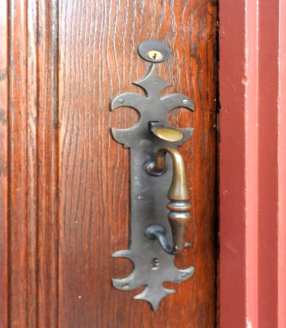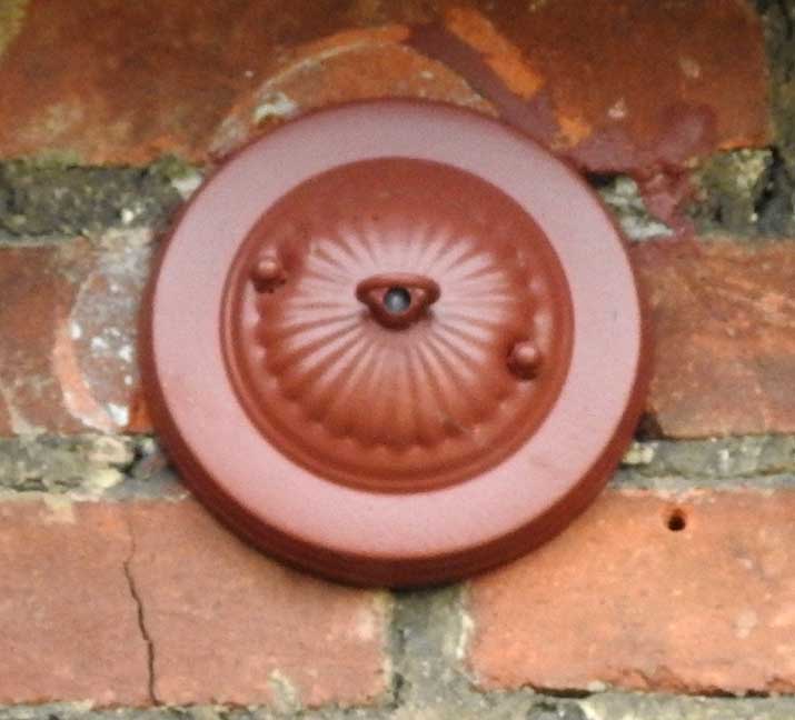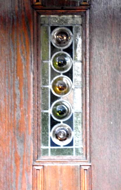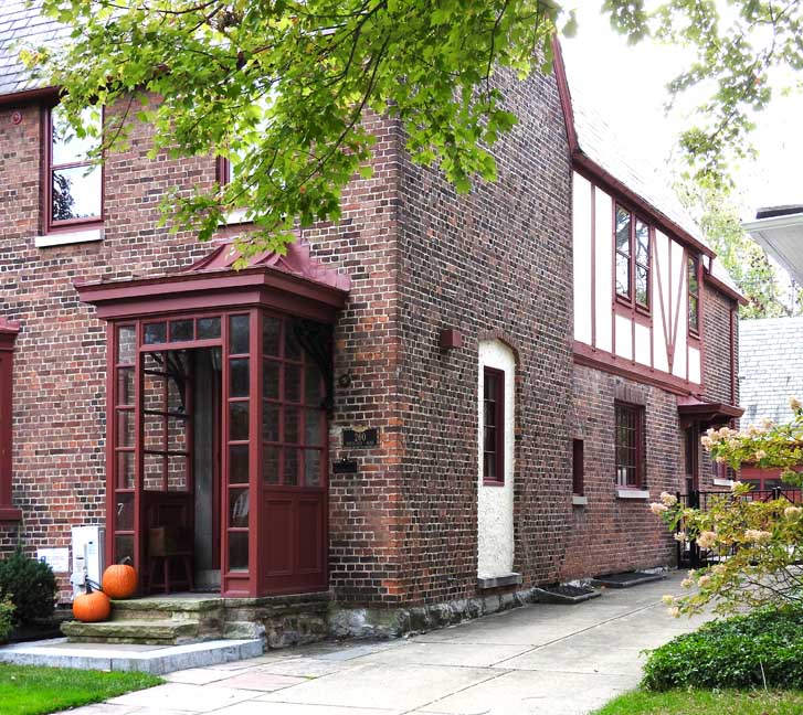 Facade ![]() Tudor Revival style Details below, starting at the top: ![]() Slate roof ![]() Tie rod anchor ![]() Living room bay window ![]() English bond brick pattern ![]() ![]() Tudor Revival plank door with bull's eye glass (detailed below:) ![]() Leaded bull's eye glass ![]() |