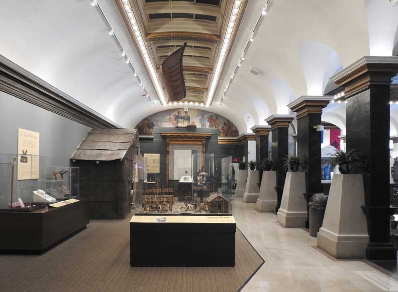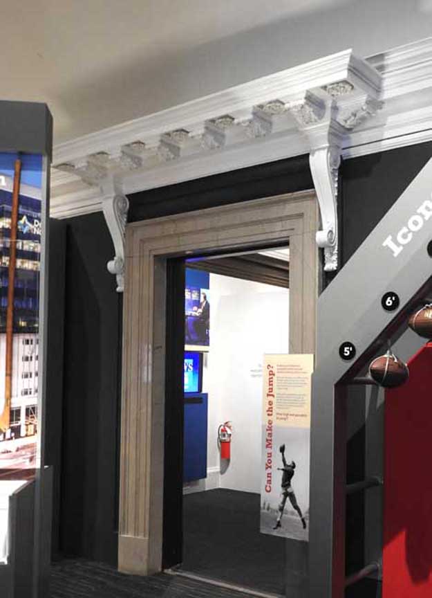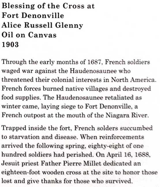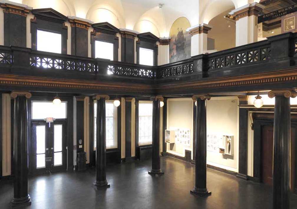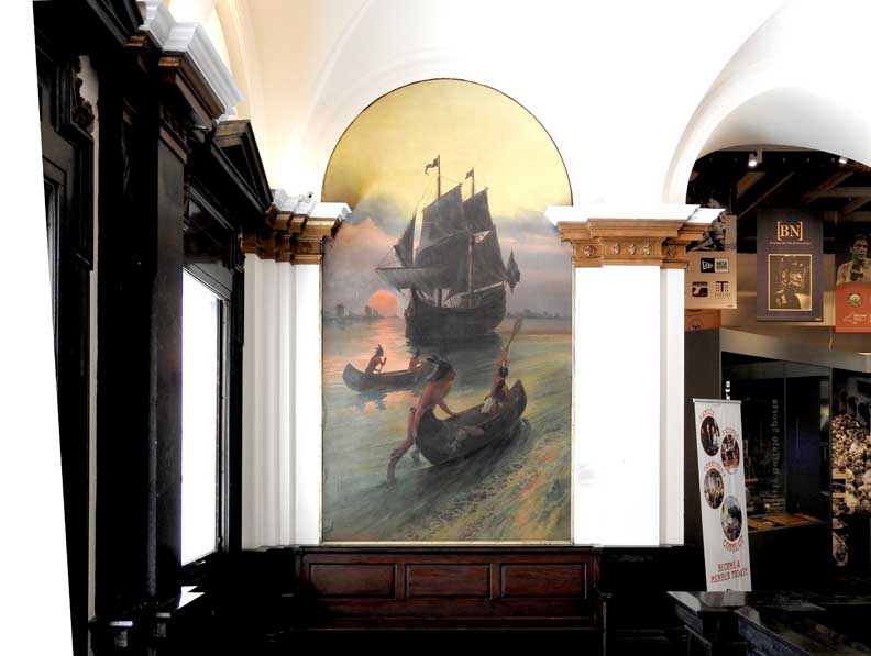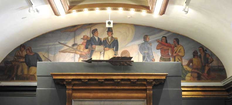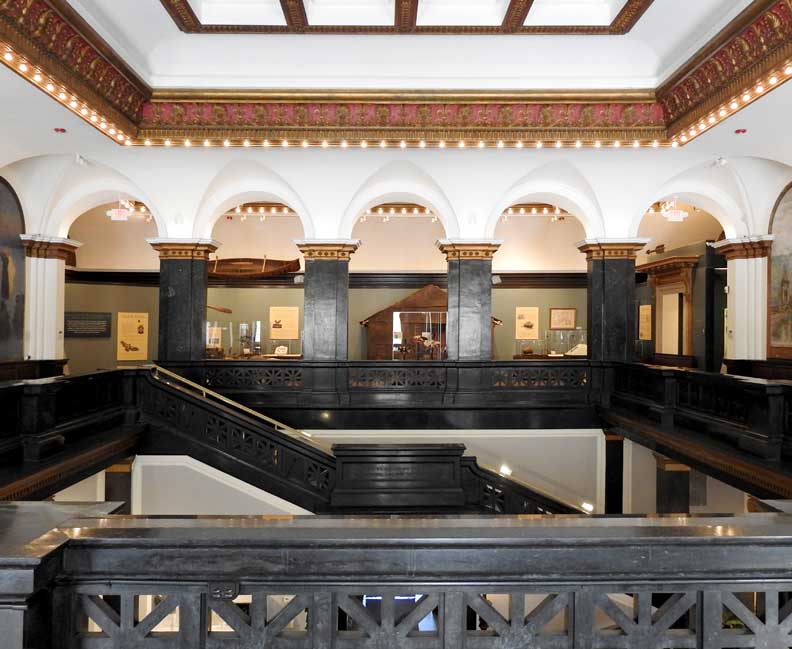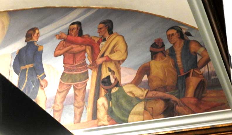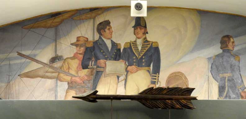 photos Second floor Galleries ![]() Seneca Nation Gallery ... Notice Oliver Perry mural at the end of the hall (3 details below:) ![]() Mural detail #1 " Perry's Visit to the Navy Yard at Scajaquada, overhead mural painted by Angelo Charles Scibetta. 1930's Works Project Administration (WPA) project. The artist is depicting the Seneca orator Red Jacket addressing Commodore Oliver Hazard Perry and his officers during the War of 1812. Oil on canvas, 6'5"x21', 1940, WPA/FAP." - Buffalo History Museum (online Jan. 2019) ![]() Perry's Visit mural detail #2 ![]() Perry's Visit mural detail #3 - Seneca orator Red Jacket addressing Commodore Oliver Hazard Perry ![]() Marble molding around the entrance to the Tim Russert Gallery ... Ancone-supported entablature (two details below:) ![]() Alternating rosettes and modillions ![]() Acanthus leaves decorate modillions ![]() Part of the permanent Tim Russert Gallery display ![]() Important map of the Buffalo waterfront and more ... See also details ![]() Gallery ceiling detail: egg-and-dart molding ![]() Gallery ceiling detail: Laurel leaf motif Return to top |