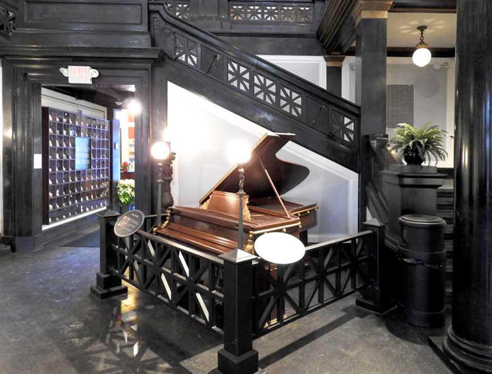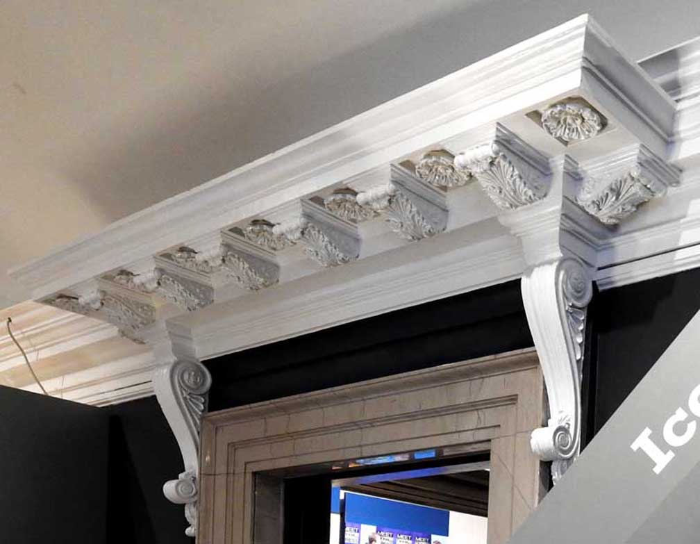photos First floor Central Court ![]() ![]() Black marble Roman Ionic columns ... Black marble balustrades with Roman lattice balusters ![]() Note dentil molding underneath balustrade ... Monolithic (single large block of stone) black marble shaft on each column ... Note top of the columns (details below:) ![]() Marble Roman lattice balusters Gilded dentil molding Gilded egg-and-dart molding Leaf-and-dart molding Ionic capital ![]() Reinforced plaster dentil molding Leaf-and-dart molding on the abacus Ionic capital on smooth (Roman) black marble shaft ![]() Grand Steinway piano ![]() Crystal chandelier Return to top |