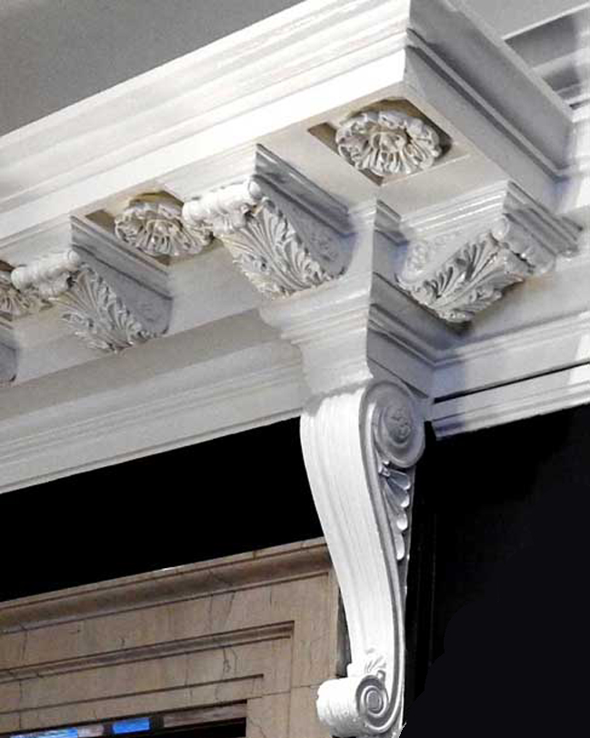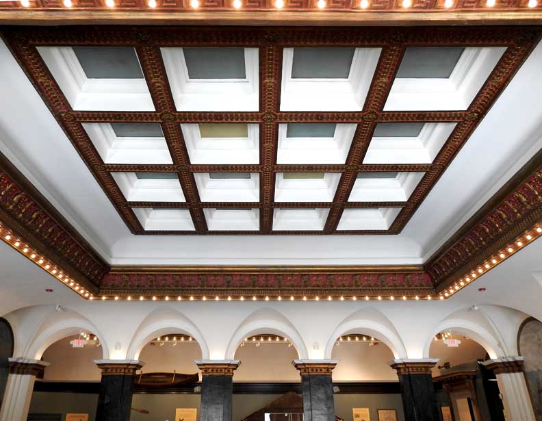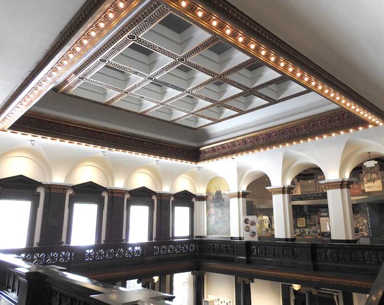 photos Second floor Central Court ![]() ![]() ![]() ![]() Modillions Ancones ![]() Modillions with acanthus leaves alternate with rosettes Ancones with acanthus leaf below ![]() ![]() Four ceiling details below: ![]() Detail #1 - Coffered ceiling ... ![]() Detail #2 - Single coffer ![]() Detail #3 - Rosette flanked by guilloches ![]() Detail #4 - Anthemia above flutes ![]() Note top of columns (detailed below:) ![]() Rosettes on column capital ... Black marble pilasters ![]() ![]() ![]() Sailing of Le Griffon mural detail ![]() Sailing of Le Griffon mural detail ![]() ![]() ![]() Two details below: ![]() Blessing of the Cross at Fort Denonville mural detail ![]() Artist's signature: Alice Russell Glenny 1903 ![]() ![]() ![]() ![]() The Triumphal Bridge mural detail ![]() The Triumphal Bridge mural detail Return to top |