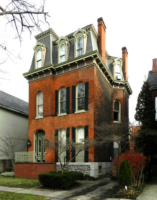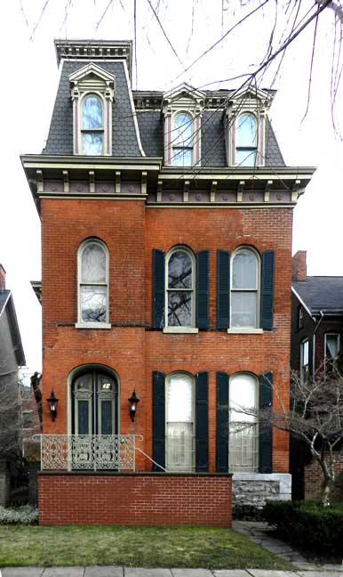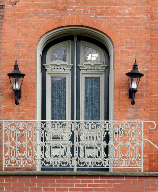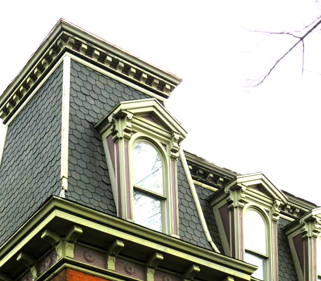![]() ![]() Flared mansard roof ![]() Bracketed cornices ...... Slate(?) roof ...... Framed, pedimented dormers ![]() Voussoirs ......... Stone sill ![]() ![]() Typical Second Empire design ![]() ![]() ![]() Medina sandstone sidewalk ![]() Onondaga limestone foundation |