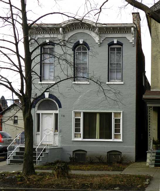 | No. 18, a flat-roofed Italianate built in 1869 sports an exquisite segmental center projecting cornice which is underpinned by a dentilated frieze and modillion bracketing while four massive brackets of complex []Italianate] scroll work support the whole projection at its points of segmentation.