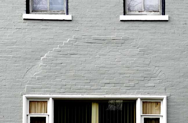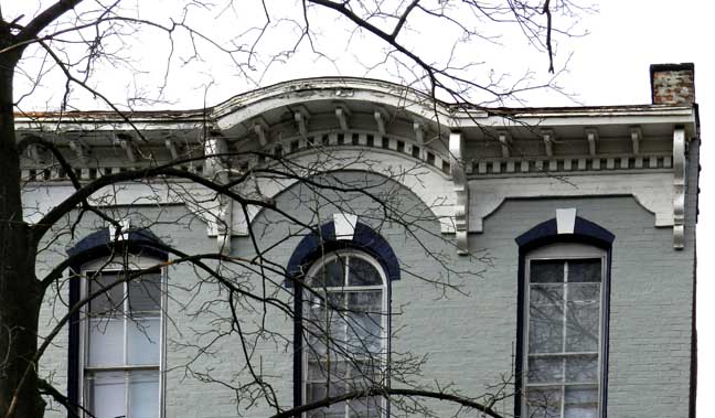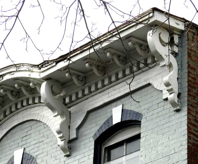 ![]() First floor window obviously not original. Note brick work above it. ![]() "... segmental center projecting cornice which is underpinned by a dentilated frieze and modillion bracketing" ..... Keystones in window crowns ..... In flanking windows, rounded window tops have been filled in to reduce the expense of glass replacement ![]() ![]() Modillions supporting cornice ... Dentils ..... Keystones in center of voussoirs ..... Typical Italianate, locally produced orange bricks have been painted ![]() ![]() Original brick work clearly indicates that the modern windows are not original. |