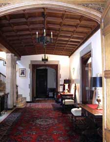 The grand home's entry vestibule, which has walls of stone and a diamond-patterned coffered ceiling, provides a foretaste of the splendor to come.