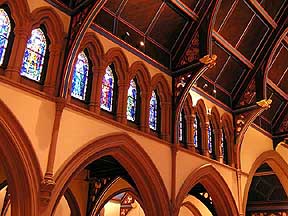 Above the arches along the north and south sides of the main aisle is a series of stained glass windows known as clerestory. The clerestory was created in 1889 following the fire, when R. W. Gibson altered the design of the building in order to create this feature. The original windows installed at that time were panels of plain colored glass.