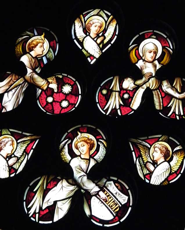 wings) and another order of angels with a flame on their foreheads Iconography in Art and Architecture: Orders of Angels Designed by John Hardman & Co. of London, England Installed 1889 Memorial to Lucretia Stanley Grosvenor (1798-1882), the wife of Rev. William Shelton, Rector of St. Paul's (1829-1881). The scene is described in Acts 20:13-27, specifically "When he had said this, he knelt down with all of them and prayed. 37They all wept as they embraced him and kissed him." in verse 37. The sadness depicted in the faces of Paul's friends is perhaps a reflection of Shelton's sorrow at the loss of his wife. LARGER SIZE beneath top photo |