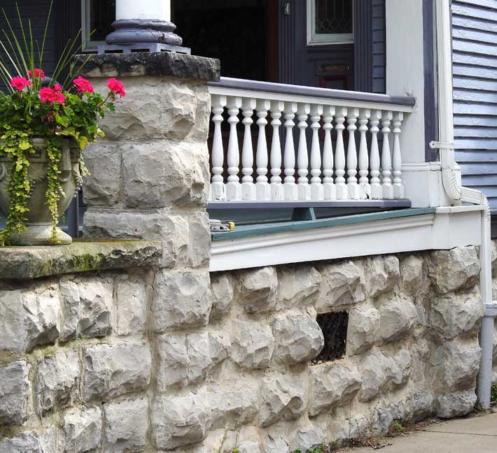 ![]() Colonial Revival style ... Facade: Dormer Palladian window ... Second floor bay windows ... Doric columns ... Vase-shaped balusters ... Painted stone foundation ![]() Dormer Palladian window ![]() Second floor bay windows with Tuscan pilasters ![]() Second floor bay windows with Tuscan pilasters ... ![]() Egg-and-dart molding ![]() Portico ... Details below: ![]() Portico ... Roman (smooth shaft) Doric column and pilaster ... Side light with leaded glass ... Vase-shaped balusters ![]() Rafter tails are an Arts & Crafts feature ... Roman (smooth shaft) Doric column ![]() Rounded balustrade ![]() Onondaga limestone? |