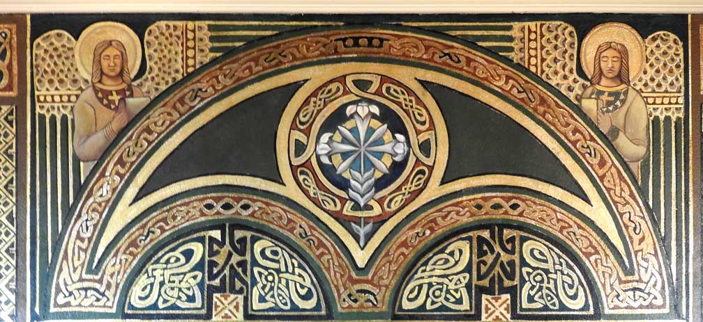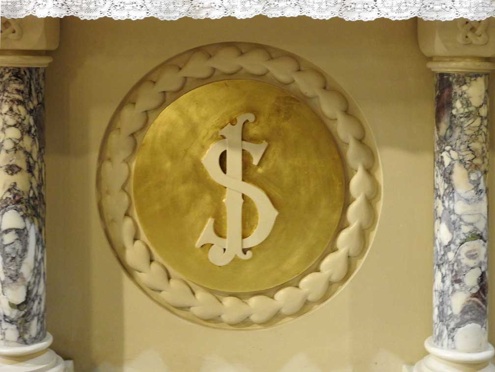 ![]() The four vertical stripes under arches are reminiscent of canon tables ... Three details below: ![]() Joseph Altar ... Canon Table detail #1 ![]() Joseph Altar ... Canon Table detail #2 ![]() Joseph Altar ... Canon Table detail #3 ![]() Joseph Altar ... Altar and tabernacle, detailed below: ![]() Joseph Altar ... Tabernacle ... Sunburst ... IHS ... Chalice ![]() Joseph Altar ... Three altar details below: ![]() Joseph Altar - Detail #1 ... Celtic cross ![]() Joseph Altar - Detail #2 ... Christogram? ![]() Joseph Altar - Detail #3: Stone column |