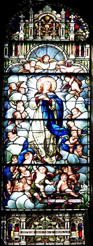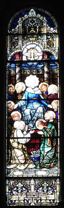 ![]() Transept ... All female saints ![]() Pentecost ... Two details below: ![]() Pentecost - Detail #1 ... Dove ... Mary and Apostles with tongues of fire ![]() Pentecost - Detail #2 ... Left figure presumably is St. Peter, whose keys to heaven are between him and the beardless St. John ![]() Assumption ... Three details below: ![]() Assumption - Detail #1 ... Halo ![]() Assumption - Detail #2 ... Fr. Nash: Bishop James Quigley appointed Rev. John J. Nash to organize a new parish in the South Park area ![]() Assumption - Detail #3 ... Artist's signature: "Innsbruck": Stained glass windows by Tyrol Art Glass, Innsbruck, Austria ![]() Coronation ... Two details below: ![]() Coronation - Detail #1 ... Trinity ... Note trefoil arch near top of scene ![]() Coronation - Detail #2 ![]() St. Agnes ... Note quatrefoil-shaped medallion ... Lilies ... Sacrificial lamb ... Detail below: ![]() St. Agnes - Detail ![]() St. Elizabeth of Hungary ... Two details below: ![]() St. Elizabeth of Hungary - Detail #1 ![]() St. Elizabeth of Hungary - Detail #2 ![]() Saint Catherine of Sienna - Detail below: ![]() Saint Catherine of Sienna - Detail: Lilies |