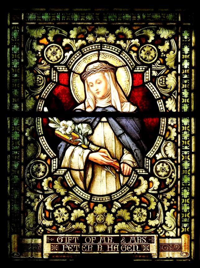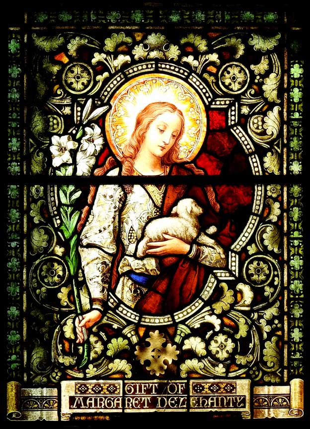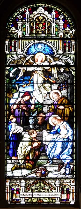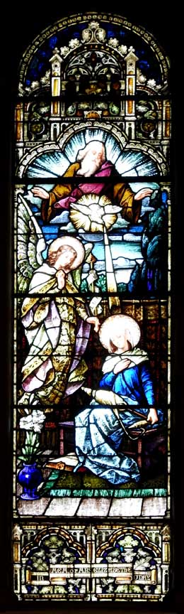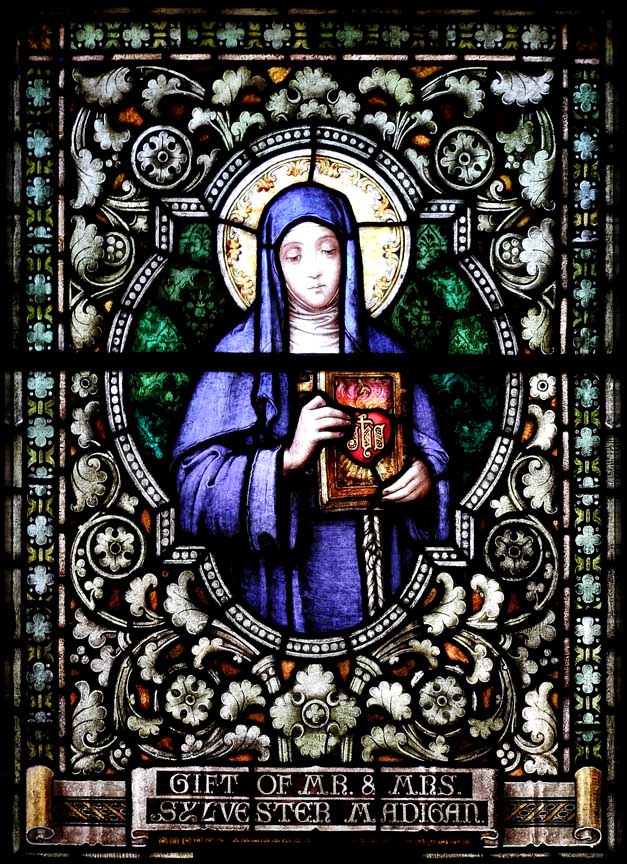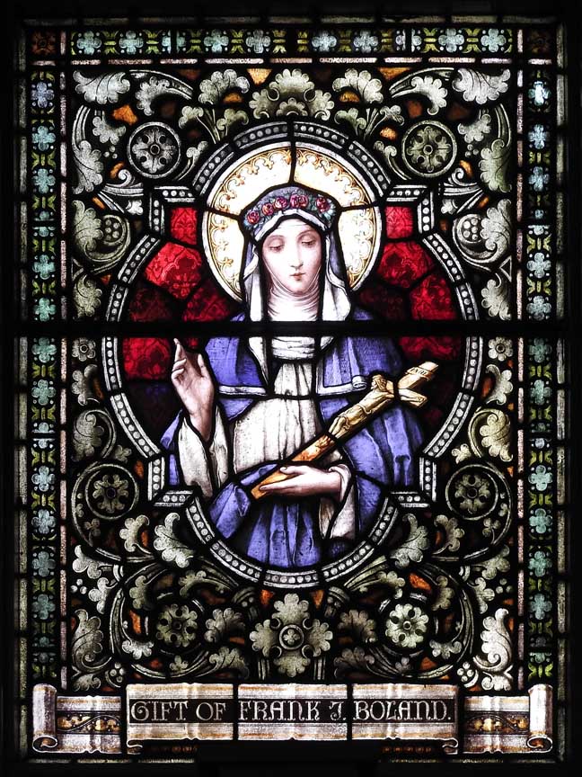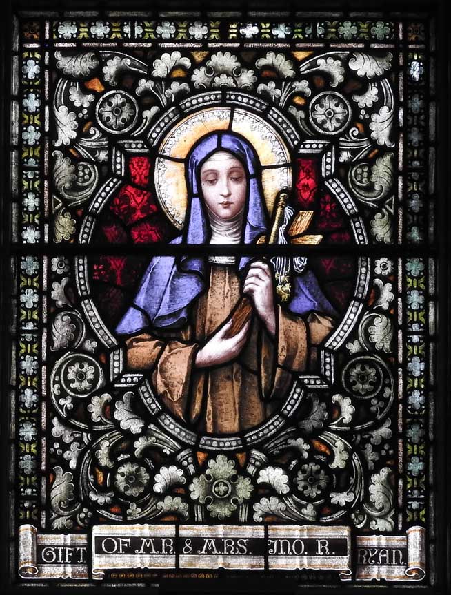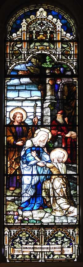South Transept![]() All female saints ... Details below: ![]() Annunciation ... Two details below: ![]() Annunciation - Detail #1 ... God the Father ... Dove/Holy Spirit ... Angel Gabriel ![]() Annunciation - Detail #2 ... Lilies are symbolic of Mary and Joseph's purity ![]() Nativity ... Two details below: ![]() Nativity - Detail #1 ... "Glory to God in the Highest" ![]() Nativity - Detail #2 ![]() Visitation - Detail ![]() Visitation - Detail #1 ... Note Celtic-decorated arch ... Each color of the stenciled architectural scene is separately fired in a kiln ... An architectural surround is a hallmark of Munich Pictorial style ![]() Visitation - Detail #2 ... Saints: Joseph ... Joachim ... Mary ... Elizabeth ![]() St. Margaret of Corona ... St. Margaret (1247-1297 - Italian of the Third Order of St. Francis. A willful girl who became the mistress of the son of Guglieromo de Pecora-Lord of Valiano and bears him a son. She and her son will join Franciscan orders and she is the patron saint of the falsely accused, hobos, homeless, mentally ill, orphaned, step children, single mothers, prostitutes, and tramps ... Detail below: ![]() St. Margaret of Corona - Detail: Lash like that used in Christ's scourging ![]() St. Jane de Chantel ... St. Jane (1572-1641 - Daughter of a Royalist president of the parliament of Burgundy. She marries, had 4 children, and when her husband died, she ran his estate and eventually started her own religious order - Order of the Visitation of Mary that took in old and poor women. She is the patron saint of forgotten people, widows, and parents separated from their children. ... Detail below: ![]() St. Jane de Chantel - Detail ![]() Saint Rose of Lima ... Note roses around her head ... Detail below: ![]() Saint Rose of Lima - Detail |