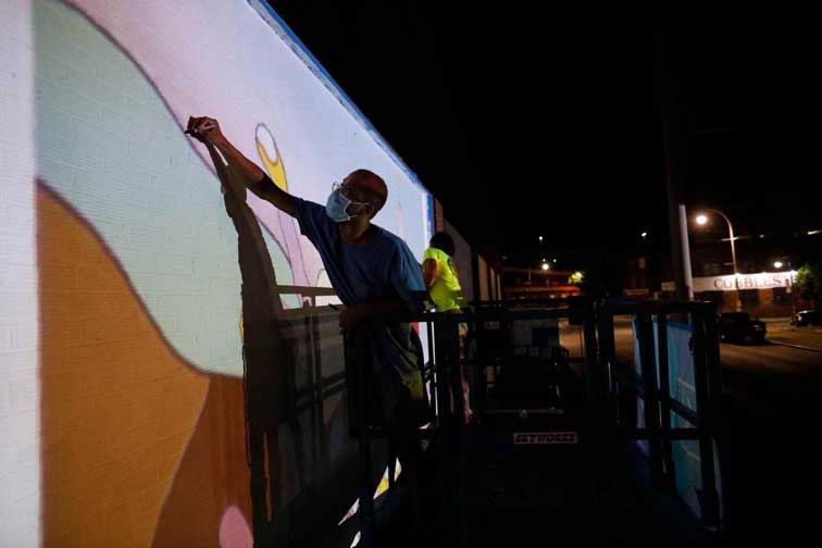 "SALUT is the visual-arts moniker of the Rochester-based artist Bradd Young. Young studied graphic design and studio art in Virginia where he began doing pop-up exhibitions that would eventually lead him to open a studio in Western New York post-graduation. It was then that Young began to develop a color pallet of soft pastels and a style merging his loves of cartoonish surrealism and fine art. " Young has displayed work in Virginia and at several venues in both Western New York and New York City. In 2018, he was the only local muralist featured in the eleventh annual WALL\THERAPY project in Rochester. In February 2019, Young was celebrated as one of the exciting talented artists at the Memorial Art Gallery’s MAG social. "Young is a featured artist of the Rochester-based gallery UUU Art Collective, which acts as a venue to both curate upcoming young artists and musicians and promote community activism. Currently, SALUT paintings are displayed throughout businesses in the downtown Rochester area." - Albright-Knox, July 30, 2020 ![]() "Al Wochensky sets up a digital projector used to overlay the artists design onto the wall surface so the artists can trace out a rough sketch to get the exact proportions they need across such a large surface. While digital projectors are new, the practice likely predates the camera obscura used by Leonardo da Vinci during the Renaissance." - Robert J. McCarthy, "DL&W murals to brighten drab Cobblestone District," - The Buffalo News, Aug 1, 2020 ![]() "Artist Bradd Young of