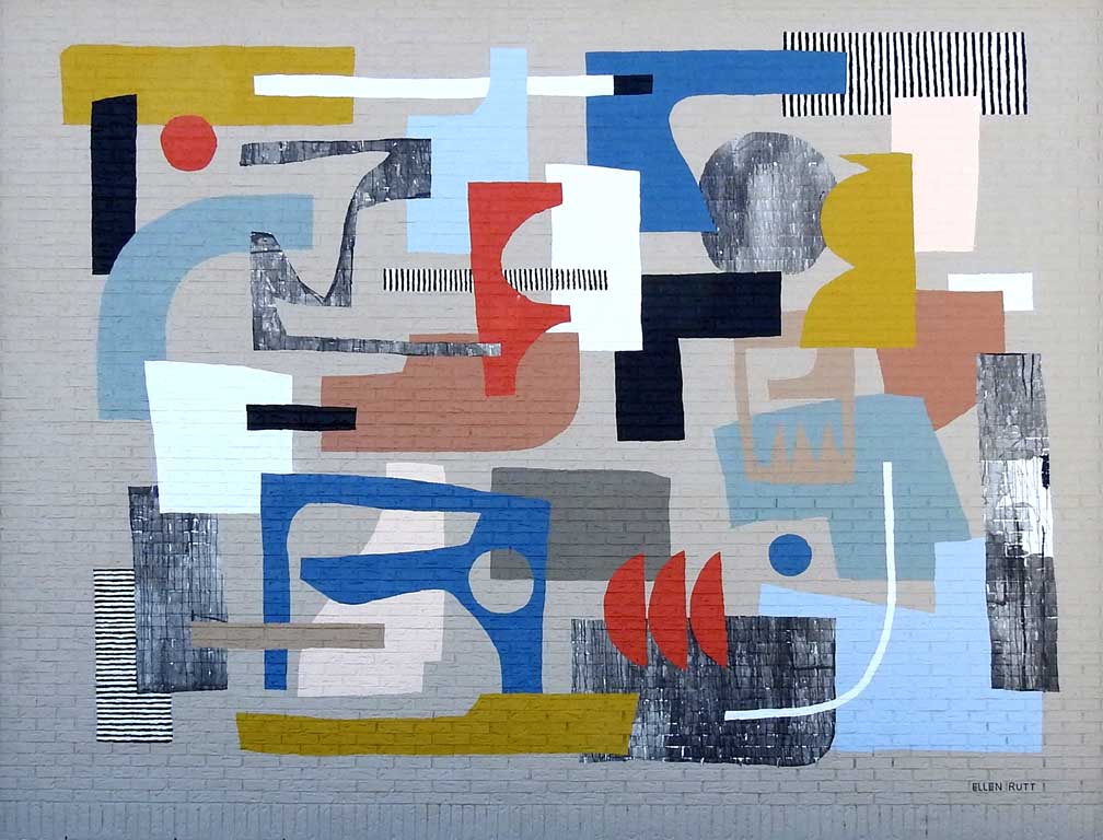 .......... ![]() Left photo source: The journal ... Mask initiated by the 2020 Covud-19 pandemic "Ellen Rutt is a Detroit-based interdisciplinary artist whose work utilizes an abstract lexicon of layered shapes and primary colors that results in improvisational and evocative installations. She facilitates conversations between materiality and movement, between place and process. Her site-specific installations, mixed-media paintings, and textiles examine notions of belonging and exclusion that expose a divide between nature and culture in the American experience. "Rutt graduated with a Bachelor of Fine Arts from the University of Michigan. She has exhibited at the Museum of Contemporary Art Detroit, Detroit Institute of Arts, the Urban Institute of Contemporary Art Grand Rapids, East Hawaii Museum of Contemporary Art, and pt. 2 Gallery in Los Angeles. She has completed murals and installations in locations around the world including France, New York, San Francisco, Canada, and Hawaii, among others. She has been featured in Juxtapoz, Forbes, W, alive, LOAM, and was recently named one of twenty-four changemakers in 2020 by Hour Detroit Magazine." - Albright-Knox, July 30, 2020 WORK IN PROGRESS - August 15, 2020 ![]() FINISHED MURAL - Photo taken August 19, 2020 ![]() FINISHED MURAL detail - Photo taken August 19, 2020 ... Artist's signature |