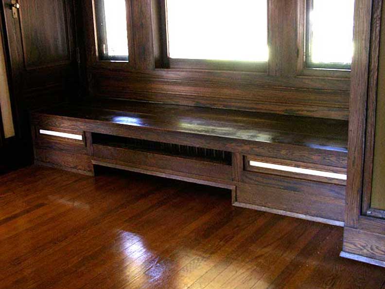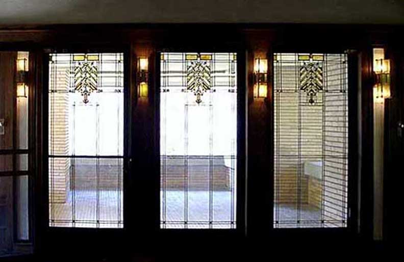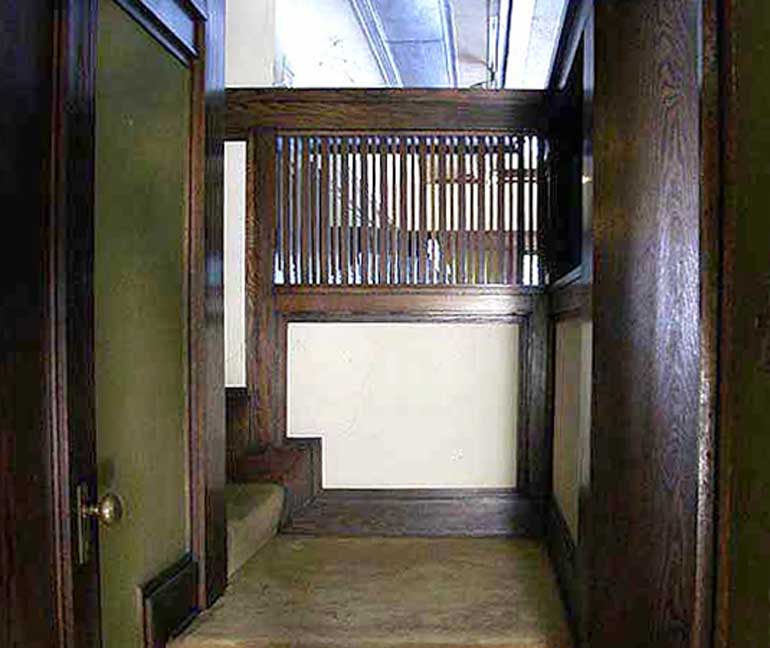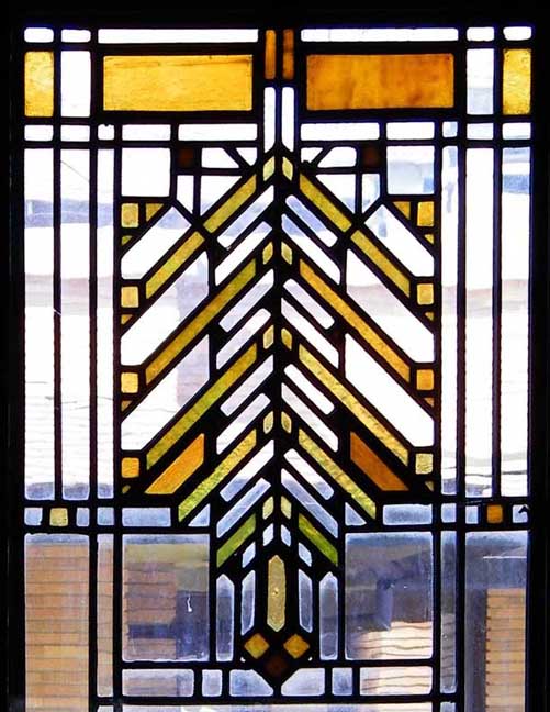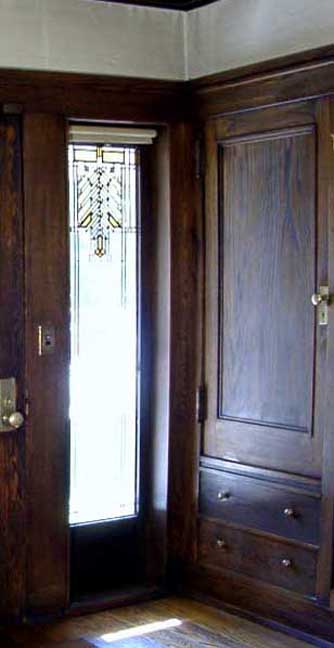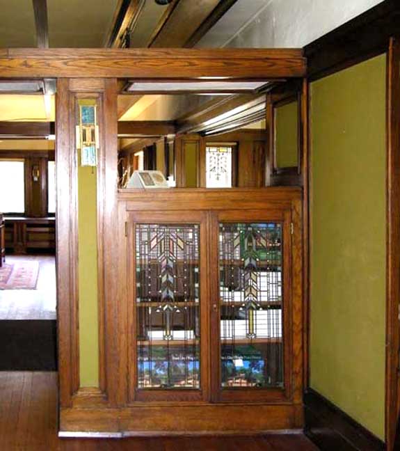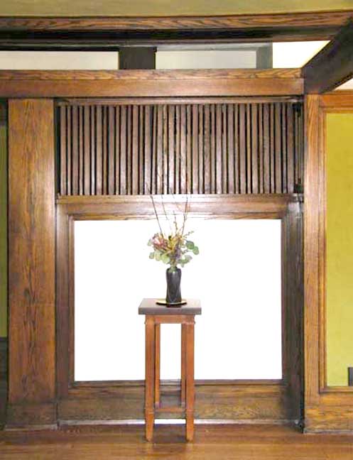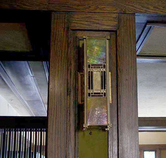 hall![]() 2002 photo - Entry hall. One of the side lights next to the front door ... All of the wood in the house is straight-sawn white oak ![]() 2002 photo - Entry hall. Opposite the front door in the entry hall ... Art glass (Wright's description of stained glass) detail below: ![]() 2002 photo - Entry hall. Stained glass detail ... Zinc came is used instead of lead in all of the Barton House windows ... (Brass came used in the Martin House) ![]() 2002 photo - Entry hall. Storage under seating bench ![]() 2002 photo - Verandah. View from the entry hall ... French doors and a window look onto the verandah ![]() 2002 photo - Verandah. View from the entry hall ![]() 2002 photo - Entry hall. Hall between living room on right and dining room on left. No separating walls ... Behind the screen are the stairs leading to the second floor. ![]() 2002 photo - Entry hall. Left: Iridescent wall sconce in hall between living and dining rooms ![]() 2002 photo - Entry hall. Stairs leading to second floor bedrooms ... Living room is on the other side of the short wall and grille ![]() 2002 photo - Entry hall. Another iridescent brass wall sconce in hall between living and dining rooms ![]() 2002 photo - Entry hall. Another iridescent brass wall sconce in hall between living and dining rooms |