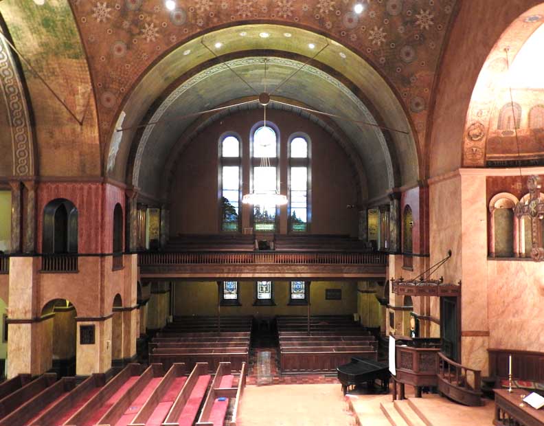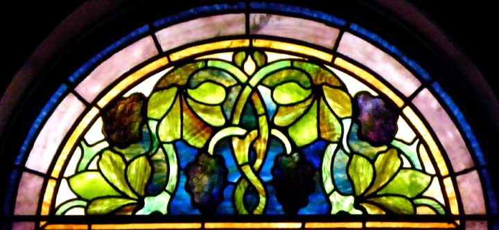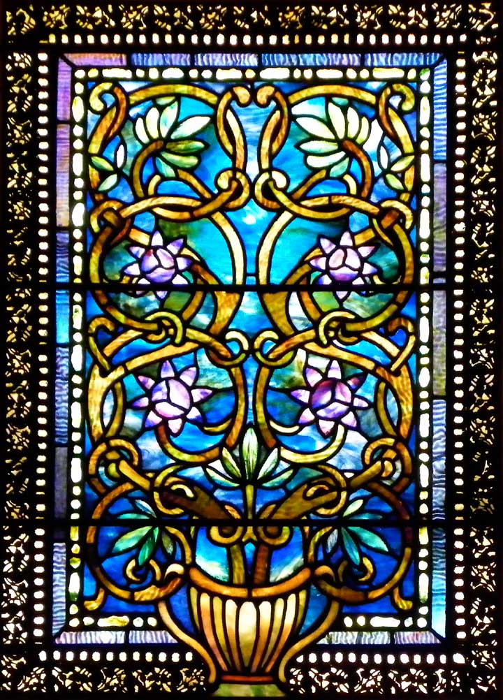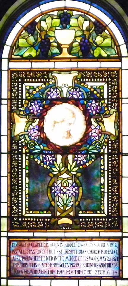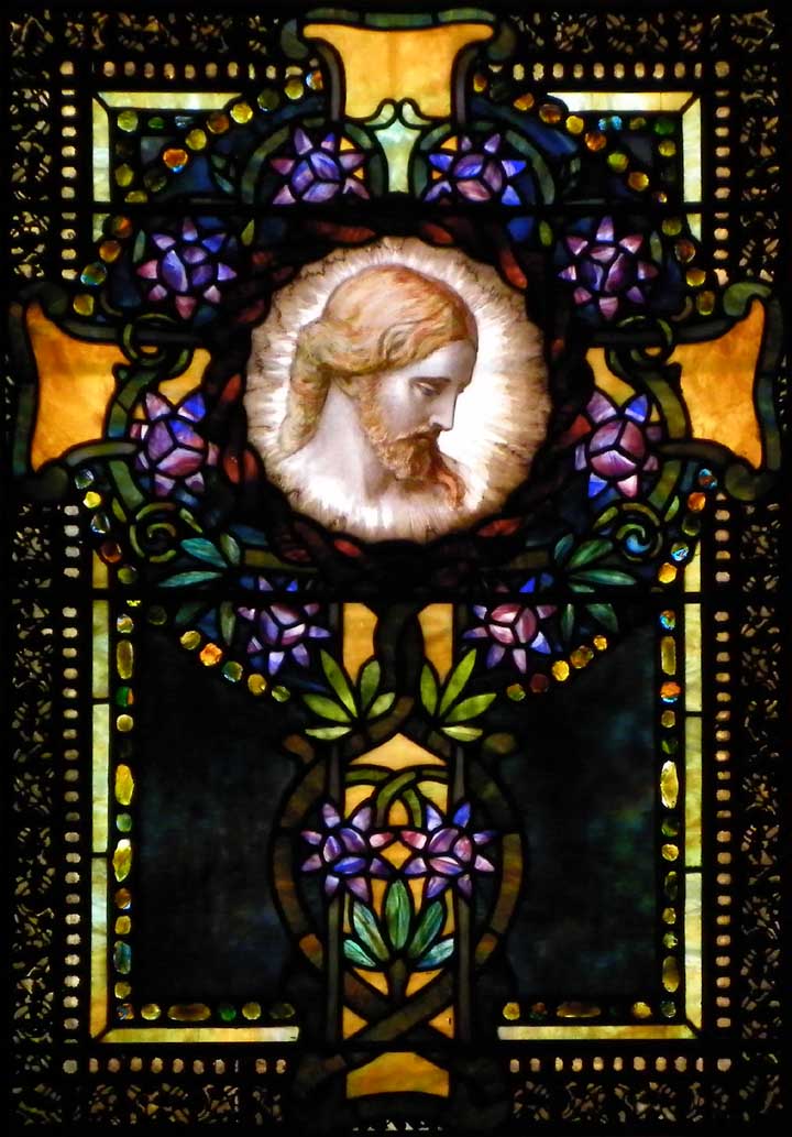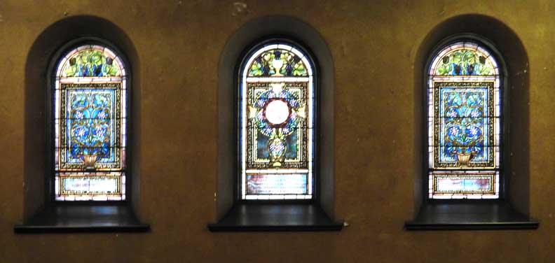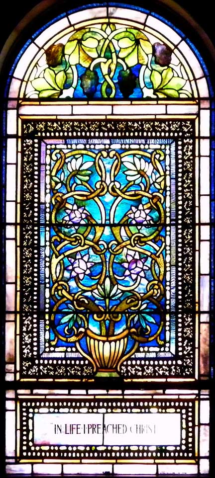 Studios: Tiffany Studios (signature in last photo below) Year installed: 1892 (Building erected 1889-91) Style: Opalescent with painted body parts