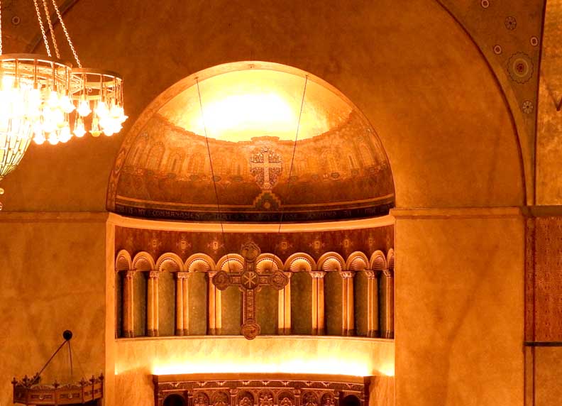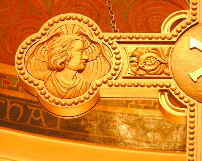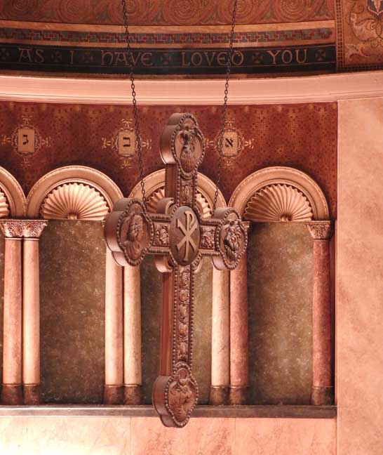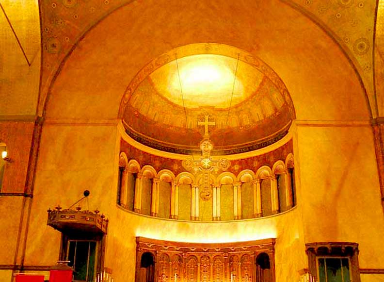 The soffit of the arch supporting the semidome of the apse features four medallions depicting the Four Evangelists, adapted from carvings on the doors of St. Mark's in Venice.