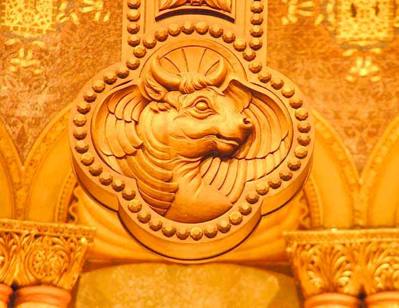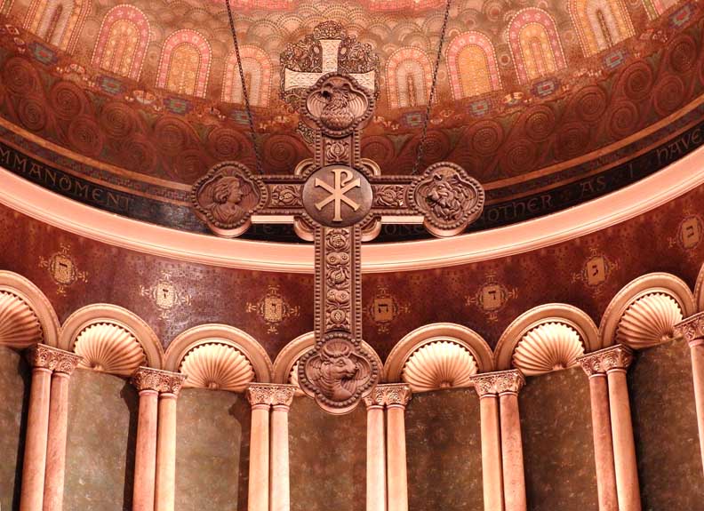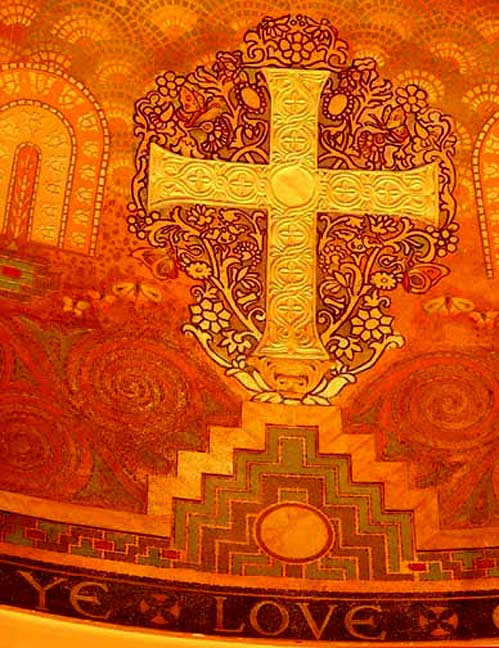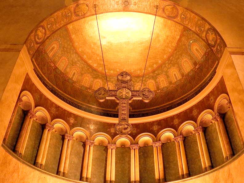 The main dome, towering 64 feet above the floor of the nave, is decorated in a Persian design 'The designs on the pendentives are adapted from the sixth century Placidia Chapel in Ravenna.