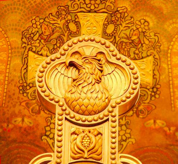 The ivory Byzantine cross represents Christ. Around the cross is the Persian style of the vine or tree of life representing eternal life.
