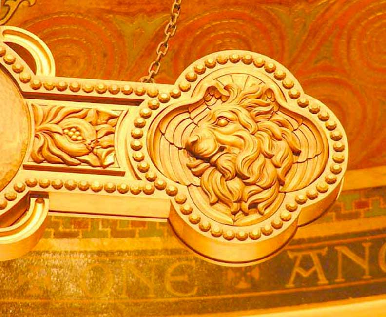 The medallions here were adapted from the carvings on the portal of St. Mark's in Venice which dates back to the sixth century. These same symbols were used on the carved wooden cross, in memory of Hazel Mielke, now hanging from the great arch, erected in 1975.