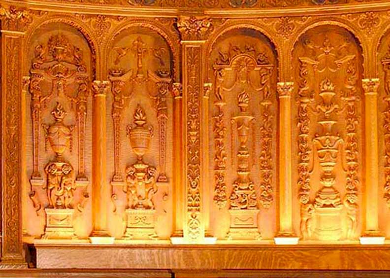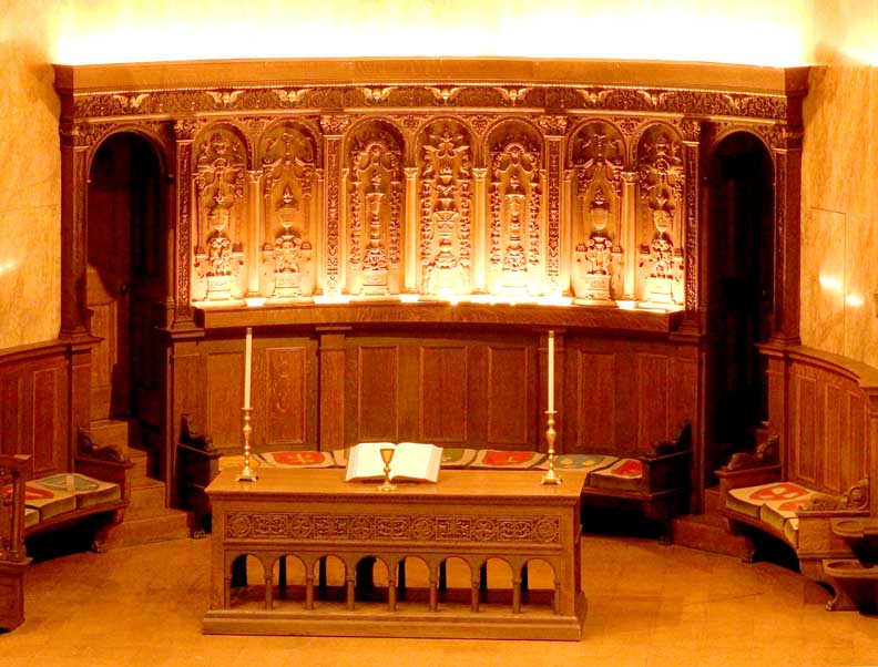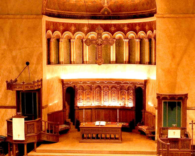 The curved screen of the chancel is composed of a beautiful frame of decorated wood carving, setting off seven symbolic panels carved by the Lippichs of Bowmansville.