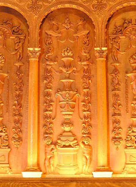 The panels on either side of the center are alike in design and represent an ornate candlestick framed by a conventional design of vines and cherubs supporting an arch.