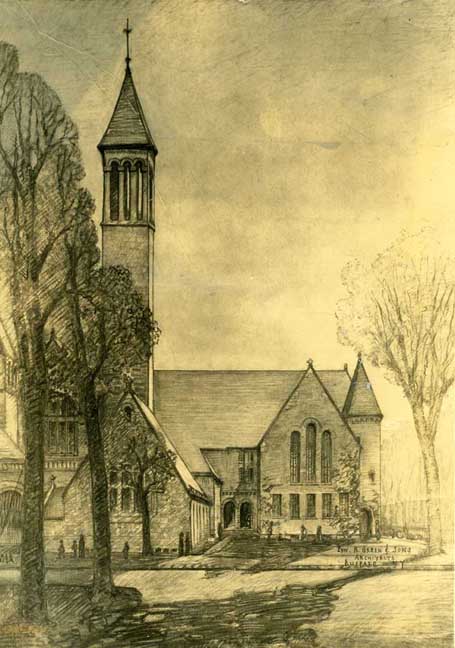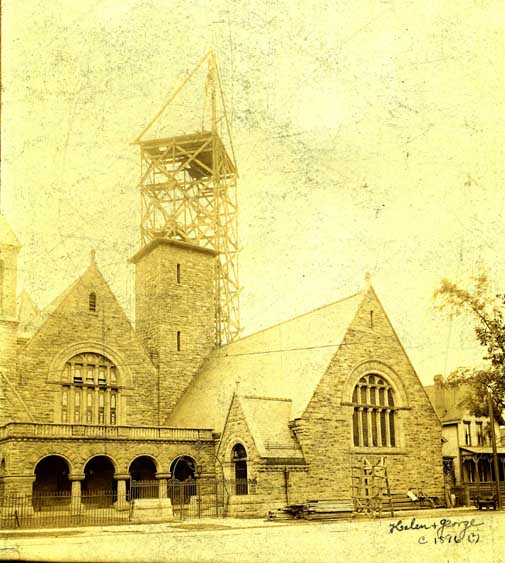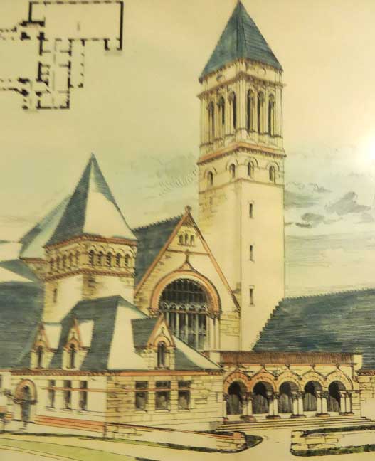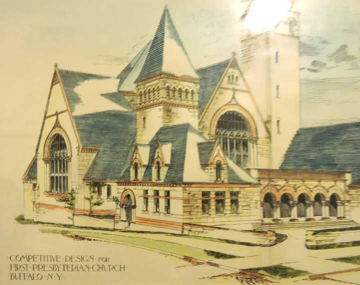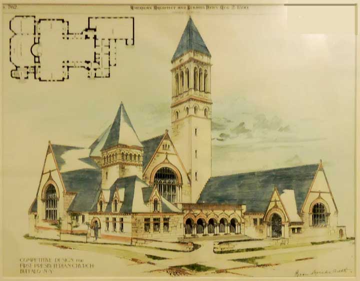 Church building #3 - 1891 First Presbyterian Church on Symphony Circle ![]() Church building #3 - 1891 First Presbyterian Church on Symphony Circle. Green & Wicks' architect's competitive design watercolor as published in the 1890 American Architect and Building News Three details below: ![]() Church building #3 - 1891 First Presbyterian Church on Symphony Circle Detail #1 ![]() Church building #3 - 1891 First Presbyterian Church on Symphony Circle Detail #2 ![]() Church building #3 - 1891 First Presbyterian Church on Symphony Circle Detail #3 ![]() Church building #3 - 1891 First Presbyterian Church on Symphony Circle. Photo courtesy of Bruce McCausland Photo of the unfinished First Presbyterian Church (circa 1895/6) before the tower was completed. This is taken from the book “The History of Buffalo & Niagara” published in 1896 and in possession of the Church. ![]() Church building #3 - 1891 First Presbyterian Church on Symphony Circle: C. 1896 tower construction The First Presbyterian Church tower construction was halted during the early 1890's and continued in 1896 when additional funds were raised. The lower section seen here was built from solid Medina sandstone and in order to save money the remaining section was built instead with a brick interior and a sandstone facing. It is partially because of this change in construction that the problems with the tower have surfaced as water infiltrated the mortar, the expansion and contraction of the ice that formed have pulverized the interior brick over the years, thus the temporary bracing system installed at 2007 was required. Photo and text courtesy of Bruce McCausland ![]() Church building #3 - 1891 First Presbyterian Church on Symphony Circle: Parish House Photo courtesy of Bruce McCausland Architect's rendering of the Parish house constructed in 1925 and designed by E.B. Green & Sons which was formed in 1917 after William Sidney Wicks retired (Green & Wicks) ![]() "On 13 December, 1891 they celebrated their first service in their completed house of worship. Upon the completion of the 163 foot tower, the congregation formally dedicated the sanctuary on 6 May, 1897." - Jim Napora, History of the First Presbyterian Church ![]() Church building #3 - 1891 First Presbyterian Church on Symphony Circle. Photo courtesy of Bruce McCausland Pre-1924 photo ... Note The Circle ![]() Church building #3 - 1891 First Presbyterian Church on Symphony Circle ... 1912 photo. Photo courtesy of Bruce McCausland ![]() Church building #3 - 1891 First Presbyterian Church on Symphony Circle . Memorial plaque for Eleanor and William Rogers |