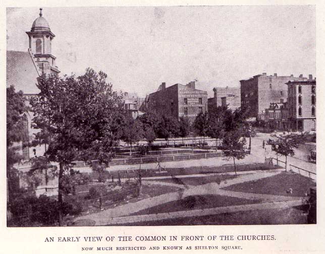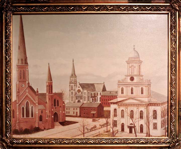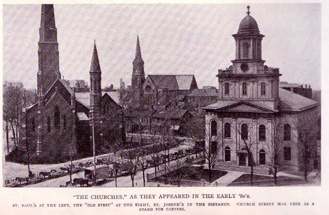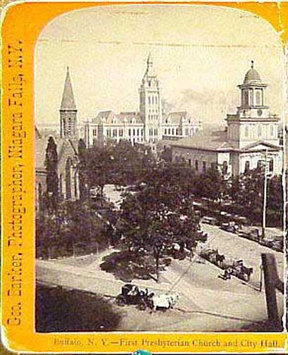 Center background: Old County Hall Right: "Old First"-1827 building ![]() Church building #2 - 1827 "Old First" Photo source: "The Picture Book of Earlier Buffalo," Frank H. Severance, ed. Buffalo Historical Society Publications, Vol. 16, 1912 Left: St. Paul's Episcopal Church