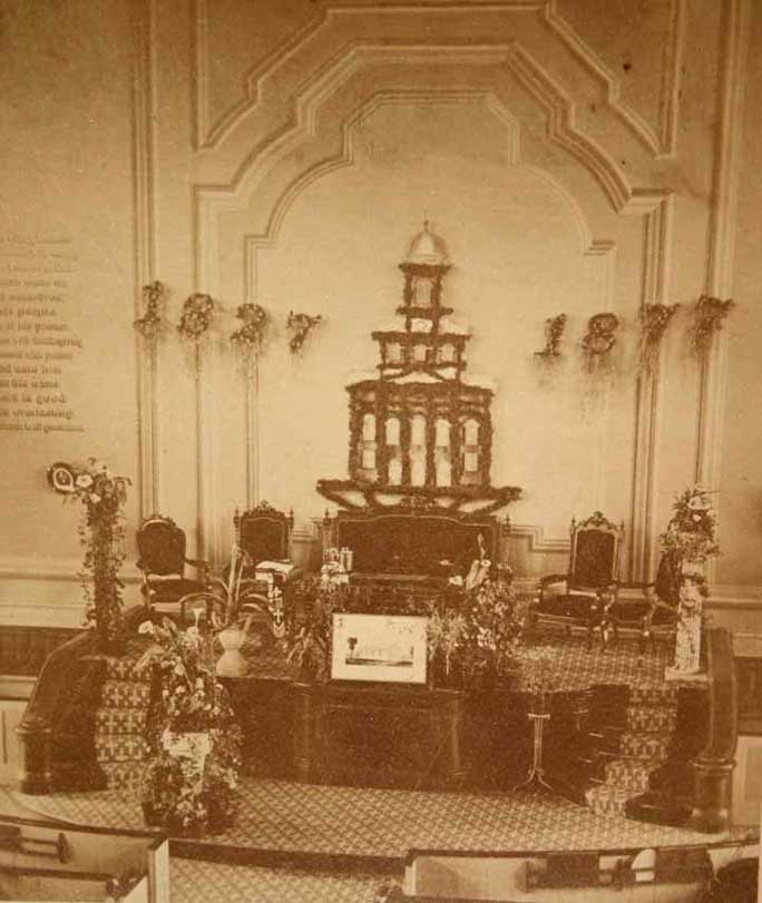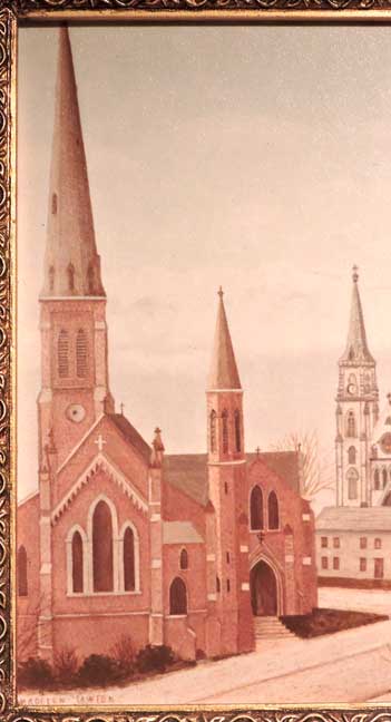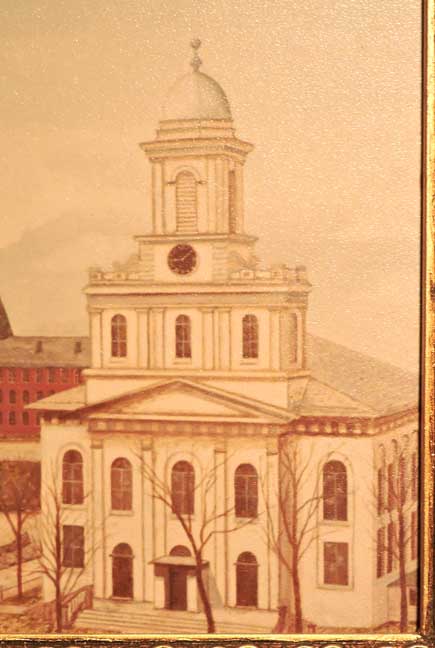 This building - the first building - was constructed in 1823 at the NW corner of Main and Church streets at a cost of $874 and was used until 1827 when the Old Brick Church was built. The 1823 building was moved several times and was last used as a brewery when it burned down early in the 20th century. This same picture is visible in the 50th anniversary photo taken in the Old Brick Church in 1877 on the chancel. |