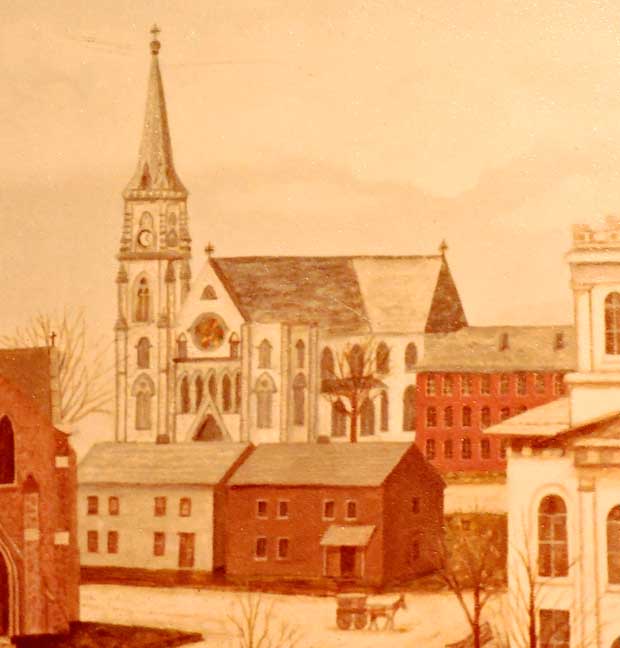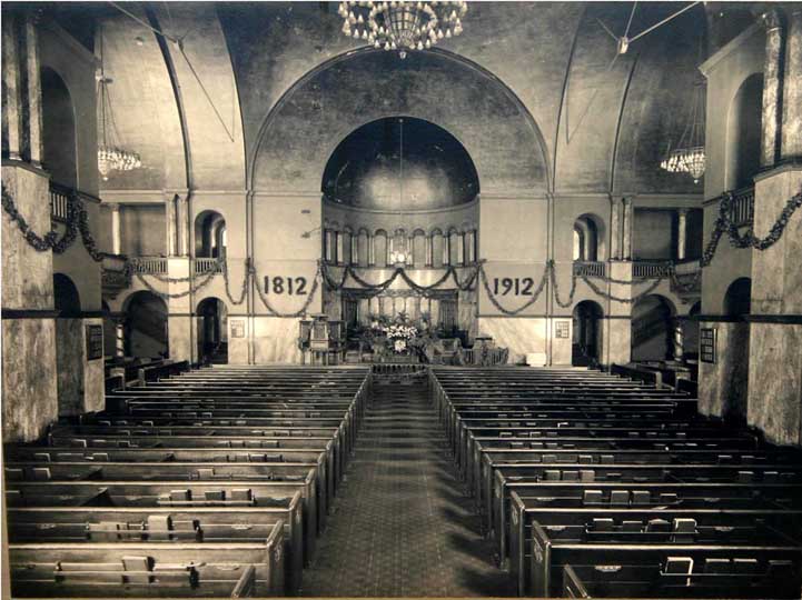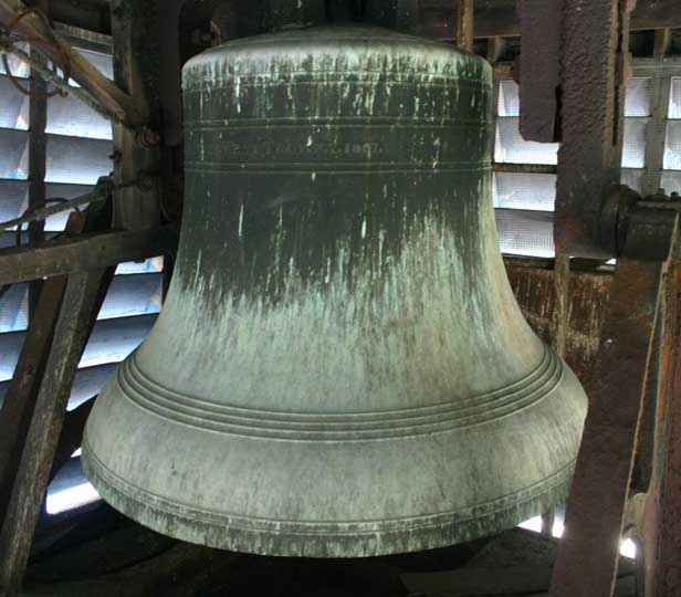Center background: St. Joseph's Cathedral Right: "Old First" -1827 building ![]() Church building #2 - 1827 "Old First" Photo source: "The Picture Book of Earlier Buffalo," Frank H. Severance, ed. Buffalo Historical Society Publications, Vol. 16, 1912 Church building #2 - 1827 "Old First" Photo courtesy of Bruce McCausland ![]() Church building #2 - 1827 "Old First" Photo courtesy of Bruce McCausland 1851 bell ...The first bell cracked in 1833 during a fire, then again in the 1840's before being recast in 1851. |
