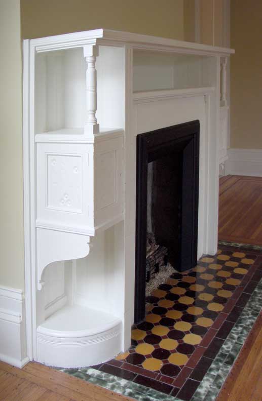 Second floor bedroom fireplace features Eastlake decoration and tile hearth