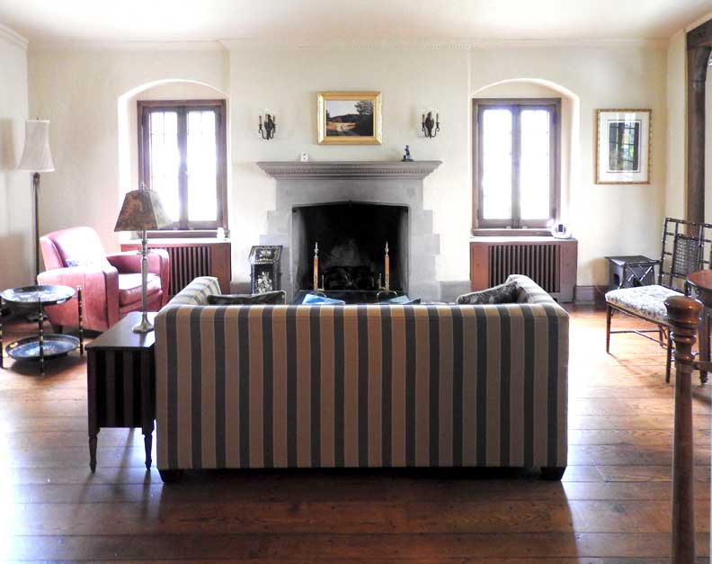 | Living room 2017 photos ![]() Living room ... Note the two windows flanking the fireplace. They are detailed below the fireplace illustration: ![]() Photo courtesy of Sherry Willoughby (2017 website). Living room ... Indiana(?) limestone fireplace features a slightly pointed Tudor Revival arch ... Brick hearth ... Two fireplace details below: ![]() Photo courtesy of Sherry Willoughby (2017 website). Fireplace detail #1 - Tudor rose - recurring throughout the house on limestone fireplace, stained glass, plaster relief, and carved woodwork in living room. ![]() Photo courtesy of Sherry Willoughby (2017 website). Fireplace detail #2 - Egg-and-dart molding ![]() Living room ... Stained glass detail below: ![]() One example of a nautical motif throughout the house ... "The