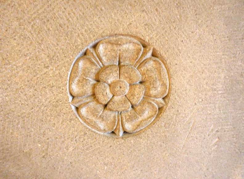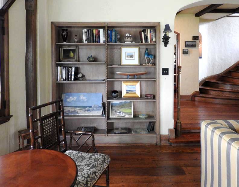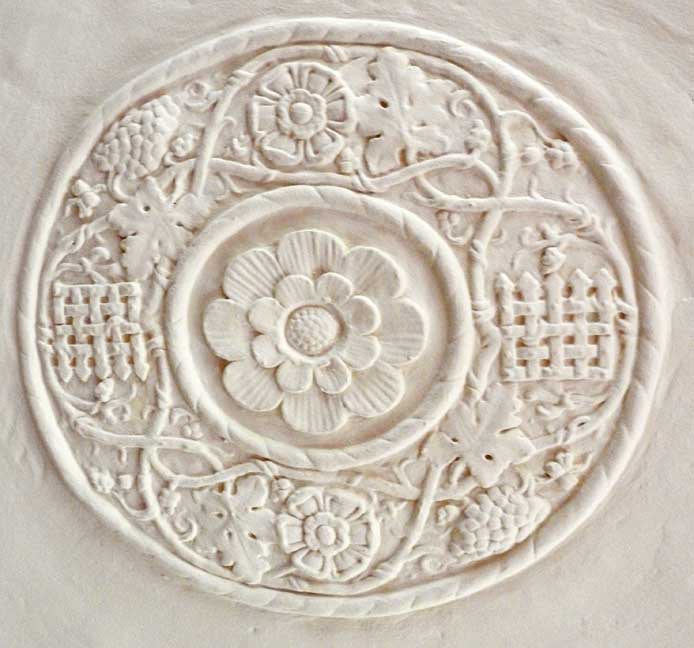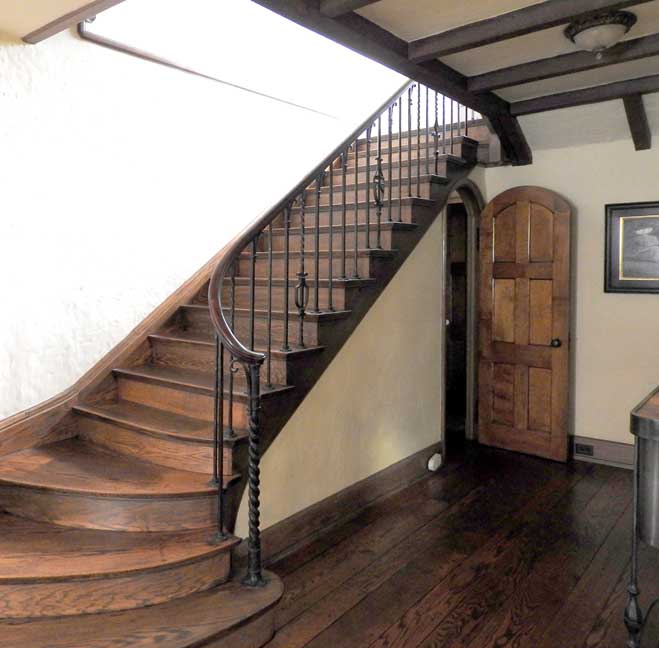 ![]() Living room ... Detail below: ![]() Stained glass Tudor rose - recurring throughout the house on limestone fireplace, stained glass, plaster relief, and carved woodwork in living room. ![]() Living room ![]() Living room ... Original oak floor with nails ![]() Living room ![]() Living room ... Ceiling plaster modillion ![]() Living room ... Note handrails ![]() Living room ... Original bookcase detail below: ![]() Rope molding ![]() Photo courtesy of Sherry Willoughby (2017 website). Grapes and grape leaves flanking center Tudor rose ... Tudor rose motif recurs throughout the house on limestone fireplace, stained glass, plaster relief, and carved woodwork in living room. ![]() Living room ... Original sconce ... "One of the original owners must have collected