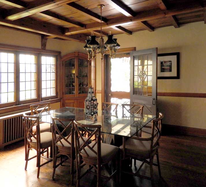 "In fact, every door in the house is custom-crafted, from the elaborate entry door with its recessed panels and carved center panel with linenfold design to all the doors within. Some bedroom doors have mitered corners to accommodate dormer-shaped rooflines. Each is unique and suited to its place." - Barry A. Muskat, "One Sweet Tudor on Tudor." Buffalo Spree, December 2007 (online July 2017) ![]() Dining room ... Ceiling detail below: ![]() Coffered ceiling ![]() Original chandelier ![]() Original leaded hanging light fixture ![]() Lozenge design in lower half of the door ... Extra wide came ... Stained glass center medallion detailed below: ![]() Extra wide came ![]() ![]() Bullseye-filled lozenge detailed below: ![]() Bullseye-filled lozenge ![]() Note rounded arch ... Left door detailed twice below ![]() Note leaded glass ... Same door below, but with different lighting: ![]() |