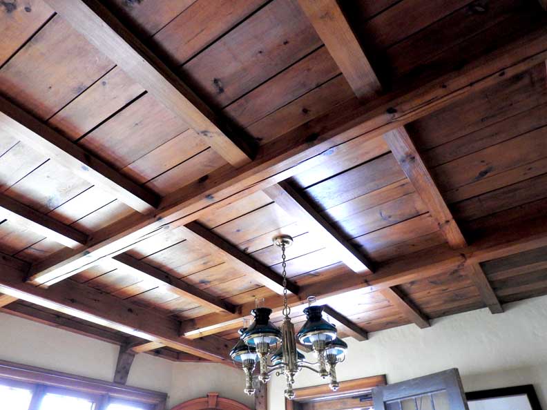 pine trim, floors, and wooden-beamed ceiling form a cozy envelope. A