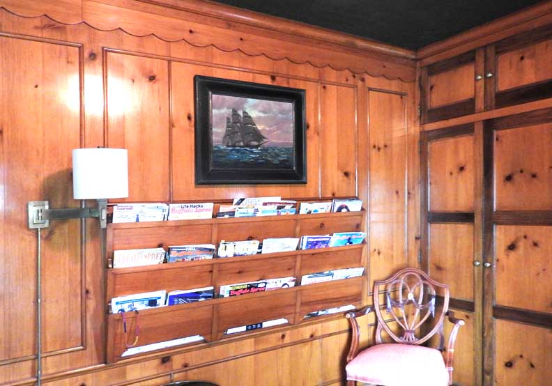 ![]() Knotty pine paneled room ... Note woodwork above the window, detailed below: ![]() Scallops and panels ![]() Room probably used as Architect Greenstein's office ![]() |