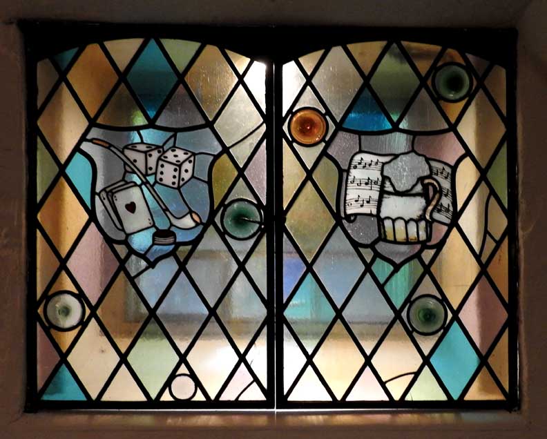flanked by large daylight windows. Art glass screens conceal them, with
