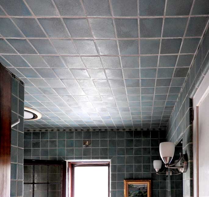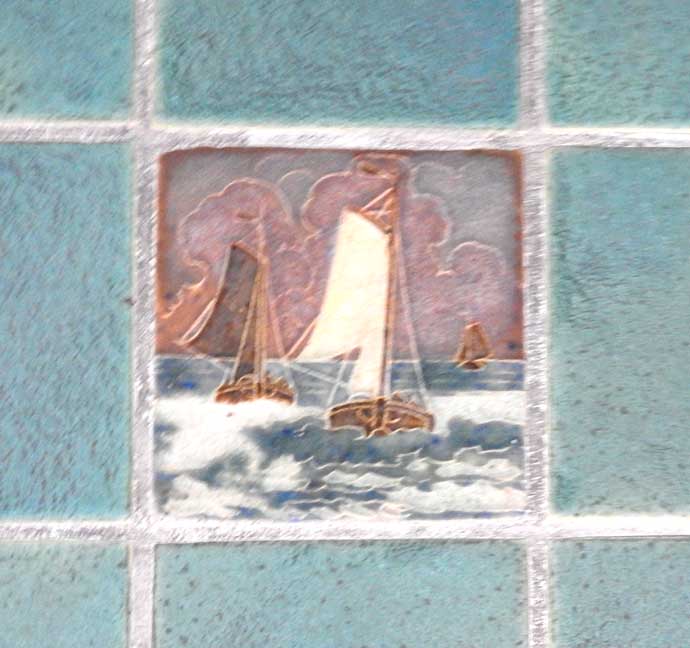 | Bathroom 2017 photos ![]() ![]() "Tile in bath is most likely from the Mosaic Tile Co. of Zanesville OH I’m confident that the tiles of boats are Mosaic since it’s their style and sample tiles in a box left in the basement contains tiles from this company. The wall & ceiling tiles are faience." - Sherry Willoughby ![]() "The original owners clearly had a love of boats and the sea. My guess is that they must have traveled extensively." - Barry A. Muskat ![]() Art Deco sink ... This is a rare sink. All original. "Henry Dreyfuss designed Crane "Neuvogue" bathroom fixtures. 1936. Henry Dreyfuss was