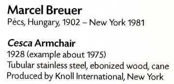 ![]() International style " The Cesca Chair got its title from Breuer’s daughter Cheska. Combining materials both traditional and new, it represented the perfect melding of cane and chromium-plated tubular steel. Designed in 1928, the original model was armless." - Mirror80 (online Nov. 2016) ![]() ![]() ![]() |