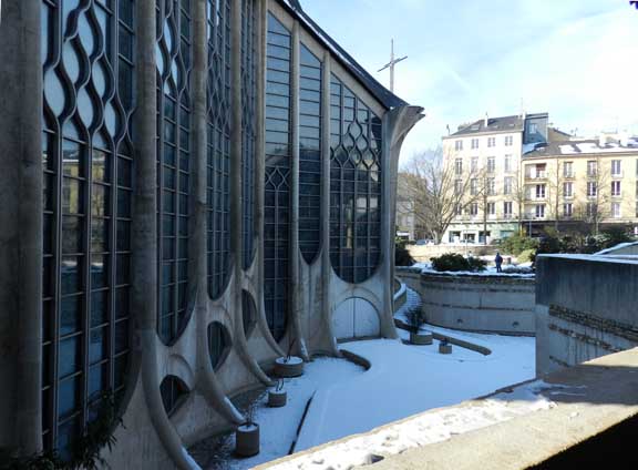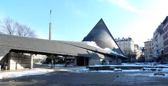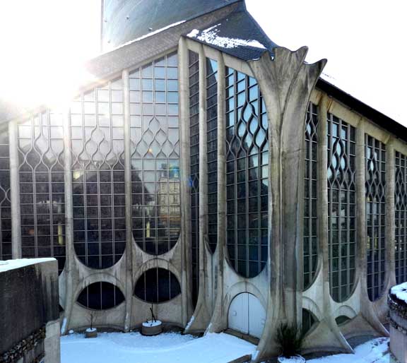 The 1979 modern style [Expressionist] church Sainte-Jeanne d'Arc and the adjacent market [ Place du Vieux-Marché] halls were designed by the architect Louis Arretche. The sweeping curves of the structure are meant to evoke both the flames that consumed Joan of Arc and an overturned Viking ship. Many early christian churches were designed in the shape of an overturned boat. - Wikipedia (April 2012)
