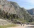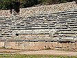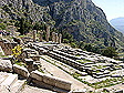 The theater is built of local Parnassos limestone and, like most of the Greek theaters, was made in the 3rd century BC, and subsequently repaired several times. It acquired its present form in Roman times and consists of three parts: the stage (skene), orchestra and auditorium (koilon). Very few of the stage buildings have survived. The orchestra, 18.5 m. in diameter, is paved and surrounded by a stone conduit for carrying away the rain water. The auditorium of the theatre, which spreads out before us, consists of 35 rows of seats and could accommodate some 5,000 spectators. In addition to dramatic performances, music contests were also held here for, since Apollo was god of music, these, along with poetry competitions, had priority in the sanctuary.