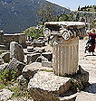 A ramp in front of the east entrance to the temple leads to the peristyle and thence to the pronaos, on the walls of which were inscriptions of such well-known sayings as "Know thyself," "Nothing in excess," as well as the famous letter E, the interpretation of which has absorbed generations of scholars from antiquity till the present day.The pronaos was followed by the cella (pron. SELL a) which seems to have been partitioned into an east and west sector. In the first there was the altar of Poseidon, statues of Zeus Moiragetes and Apollo Moiragetes, the iron throne of the poet Pindar and the altar of Hestia, in which the immortal flames always burned.