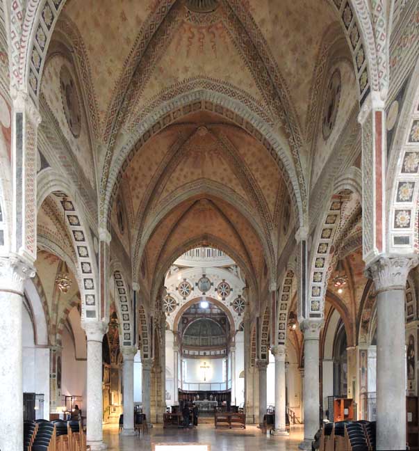 ![]() Mostly Gothic interior ![]() Romanesque rounded arches ... Gothic pointed arches ... Groin vault ![]() ![]() ![]() Marble balustrade |