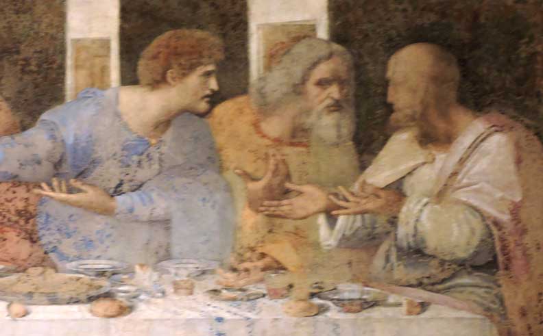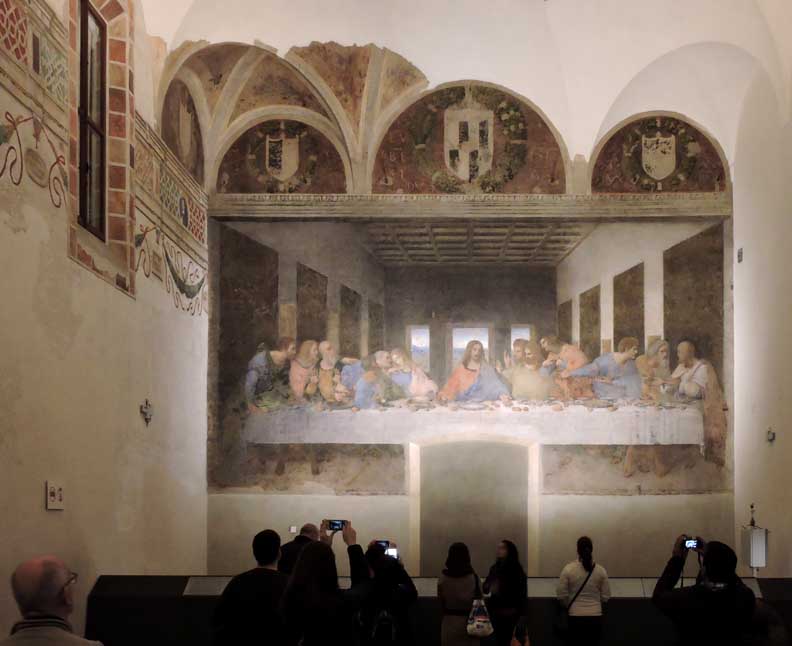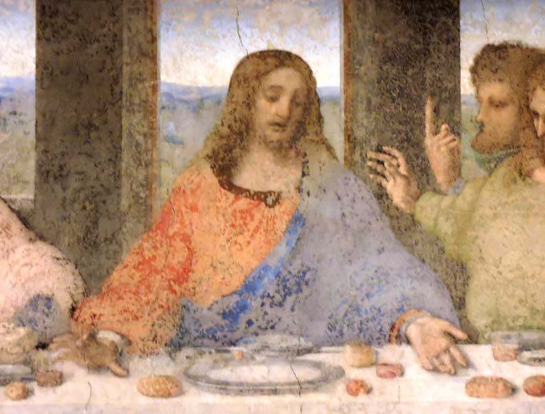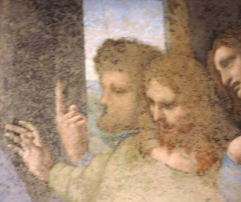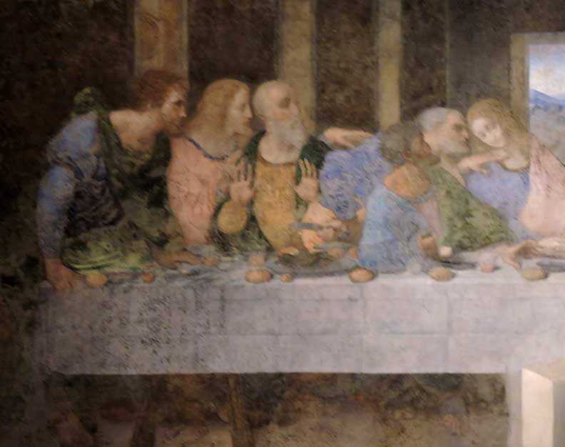 2016 photos ![]() Left: Covent where the mural was painted ... Center: Cloister - a covered walk in a convent, monastery, college, or cathedral, typically with a wall on one side and a colonnade open to a quadrangle on the other ... Right: Church ![]() Convent entrance. "During World War II, on the night of 15 August 1943, an Anglo-American aerial bombardment hit the church and the convent. Much of the refectory [where the mural was painted] was destroyed, but some walls survived, including the one that holds the "The Last Supper," which had been sand-bagged in order to protect it. Some preservation works are done to maintain it for the future." - Wikipedia: Santa Maria delle Grazie (online April 2016) ![]() ![]() Although the room was originally used as a refectory - a room for communal meals - today the room is a museum. An important restoration of the Last Supper was completed at the end of the 1990. Careful treatment of the extremely delicate and considerably deteriorated paint layer restored the work’s hidden colours. Details below: ![]() Note the tie rod anchor at bottom just left of center ![]() ![]() Far right: St. John the Apostle, depicted usually as a young man without a beard. ![]() ![]() Ceiling above Jesus ![]() ![]() ![]() ![]() |