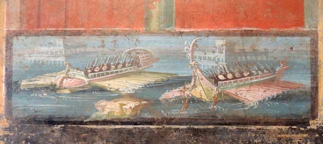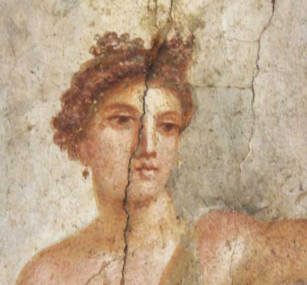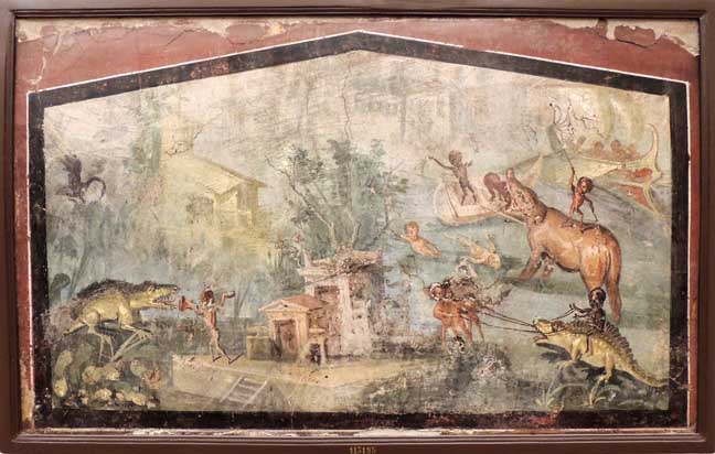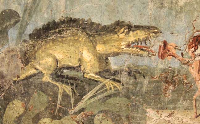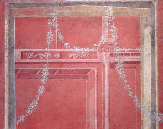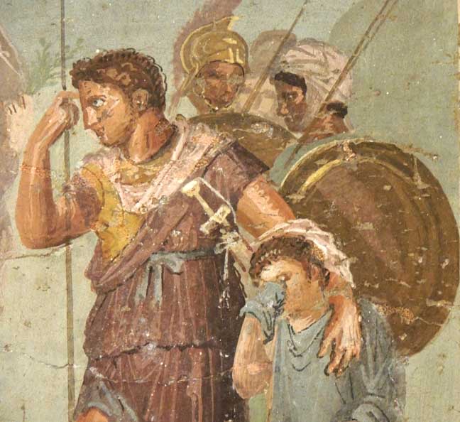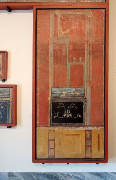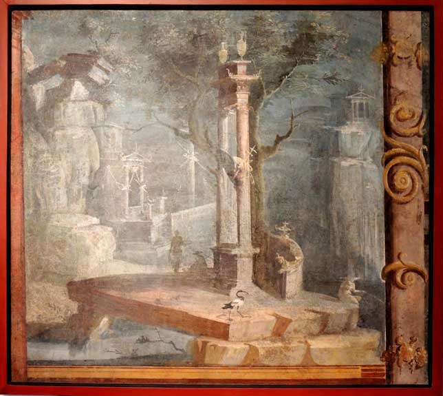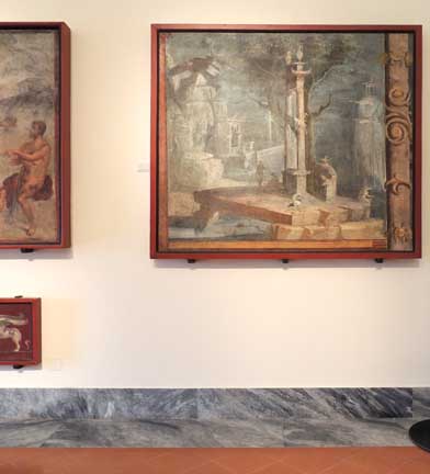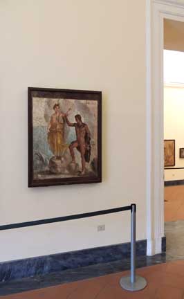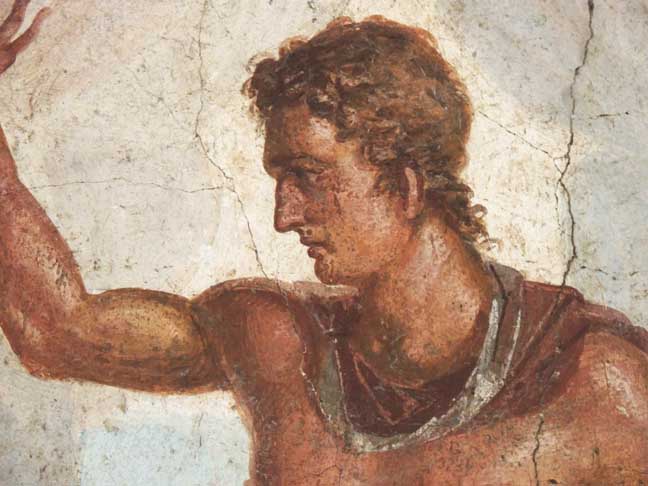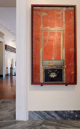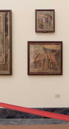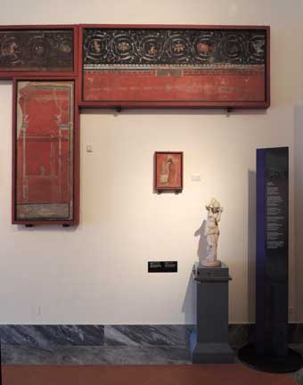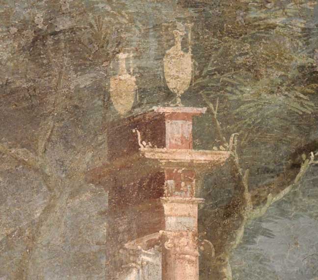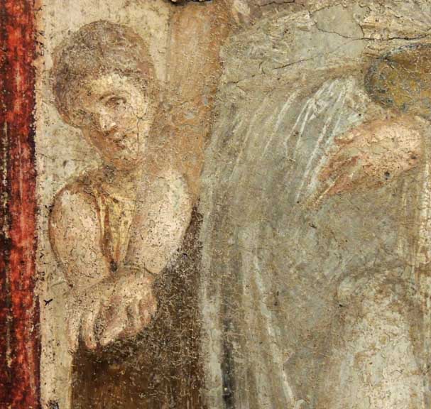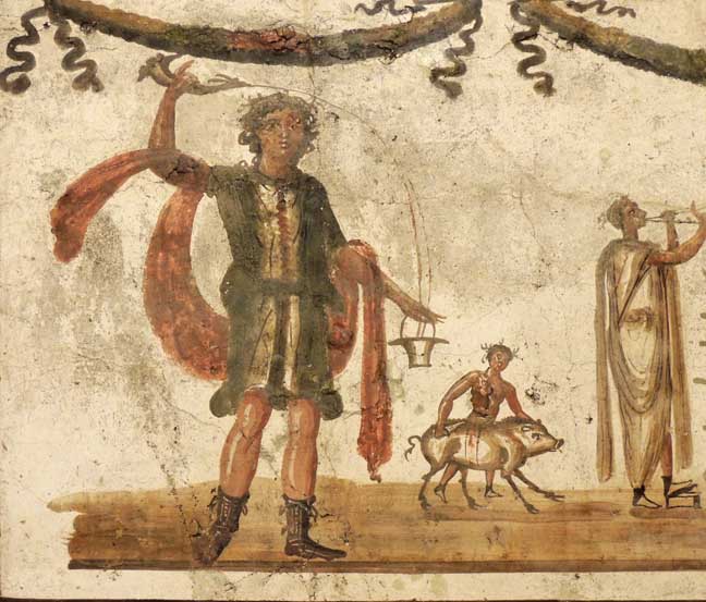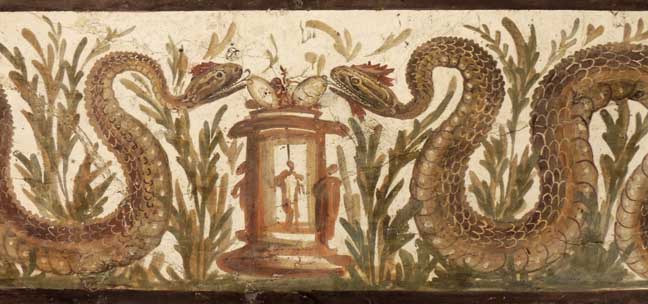 In the upper panel, the lares, the two figures on the sides with drinking horns, are pouring wine into a small bucket. They stand to either side of the sacrifice, carried out by the "genius" assisted by servants and a musician with double-flute. In the lower panel, a pair of snakes, bringers of prosperity and abundance, have reached the offerings of eggs placed on an altar. ![]() The Lares and the Sacrifices Detail - Upper panel Left: One of two lares ... Center: servant (with sacrifice?) ... Right: flutist ![]() The Lares and the Sacrifices Detail - Upper panel Left: Flutist ... altar ... "Genius" ... Right: servant ![]() The Lares and the Sacrifices Detail - Upper panel |