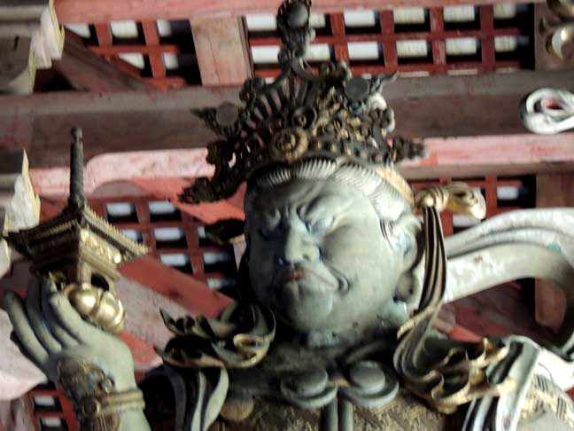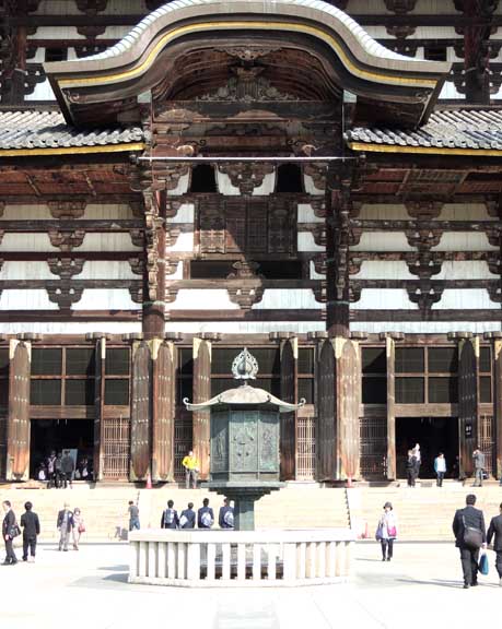 order to lower the temple's influence on government affairs. The Great Buddha Hall (Daibutsuden) has been rebuilt twice after fire. The current building was finished in 1709, and although immense - 187 feet long and 164feet wide - it is actually 30% smaller than its predecessor. Until 1998, it was the world's largest wooden building. The great image of Vairocana - the Great Buddha statue - was the center of rituals and prayers for the peace of the nation, protection against epidemics, crops’ improvement and bringing prosperity to the people. "...by the time the Buddha was completed in 751, it had consumed most of Japan's bronze production for several years and left the country almost bankrupt. The Great Buddha was finally dedicated in 752 with great pomp and ceremony. The emperor and his family were present for the occasion, as were hundreds of local monks and ambassadors from China, India and more distant places. The statue was dedicated by "opening his eyes" - an Indian priest stood on a specially built platform and painted in the eyes using a gigantic brush. The Great Buddha statue has also been damaged, especially due to earthquakes, and recast several times. The current statue dates from 1692." - Sacred Destinations (online March 2014) |